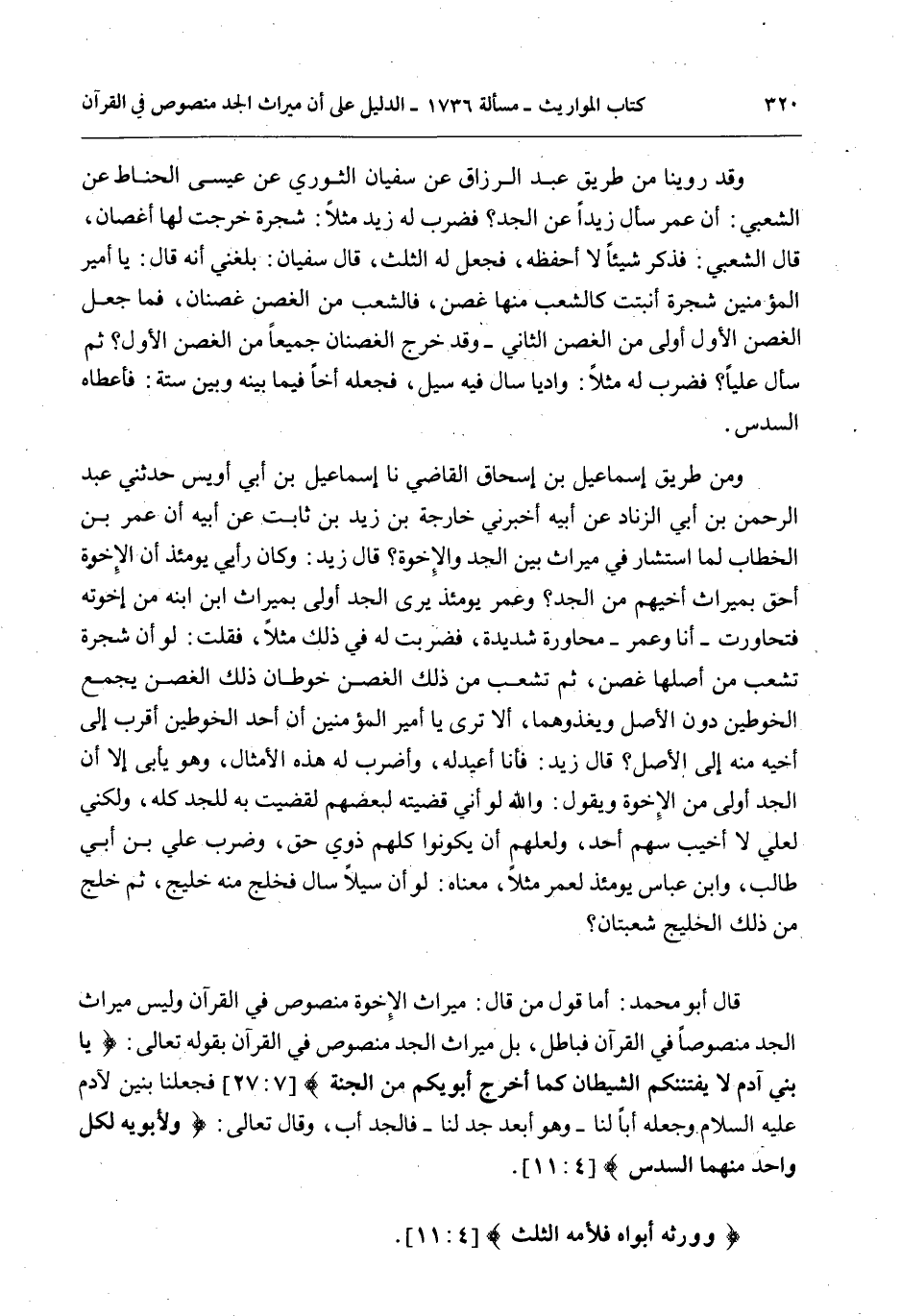 وَقَدْ رُوِّينَا مِنْ طَرِيقِ عَبْدِ الرَّزَّاقِ عَنْ سُفْيَانَ الثَّوْرِيِّ عَنْ عِيسَى الْحَنَّاطِ عَنْ الشَّعْبِيِّ: أَنَّ عُمَرَ سَأَلَ زَيْدًا عَنْ الْجَدِّ؟ فَضَرَبَ لَهُ زَيْدٌ مَثَلًا: شَجَرَةً خَرَجَتْ لَهَا أَغْصَانٌ، قَالَ الشَّعْبِيُّ: فَذَكَرَ شَيْئًا لَا أَحْفَظُهُ، فَجَعَلَ لَهُ الثُّلُثَ، قَالَ سُفْيَانُ: بَلَغَنِي أَنَّهُ قَالَ: يَا أَمِيرَ الْمُؤْمِنِينَ شَجَرَةٌ أَنْبَتَتْ كَالشُّعَبِ مِنْهَا غُصْنٌ، فَالشُّعَبُ مِنْ الْغُصْنِ غُصْنَانِ، فَمَا جُعِلَ الْغُصْنُ الْأَوَّلُ أَوْلَى مِنْ الْغُصْنِ الثَّانِي - وَقَدْ خَرَجَ الْغُصْنَانِ جَمِيعًا مِنْ الْغُصْنِ الْأَوَّلِ؟ ثُمَّ سَأَلَ عَلِيًّا؟ فَضَرَبَ لَهُ مَثَلًا: وَادِيًا سَالَ فِيهِ سَيْلٌ، فَجَعَلَهُ أَخًا فِيمَا بَيْنَهُ وَبَيْنَ سِتَّةٍ: فَأَعْطَاهُ السُّدُسَ.