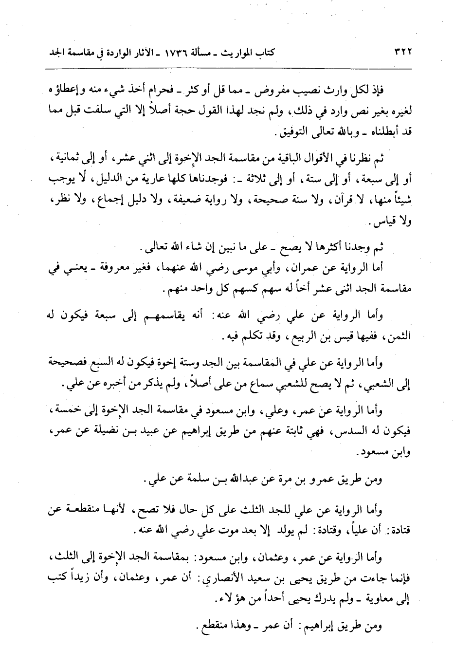 ثُمَّ نَظَرْنَا فِي الْأَقْوَالِ الْبَاقِيَةِ مِنْ مُقَاسَمَةِ الْجَدِّ الْإِخْوَةَ إلَى اثْنَيْ عَشَرَ، أَوْ إلَى ثَمَانِيَةٍ، أَوْ إلَى سَبْعَةٍ، أَوْ إلَى سِتَّةٍ، أَوْ إلَى ثَلَاثَةٍ -: فَوَجَدْنَاهَا كُلَّهَا عَارِيَّةً مِنْ الدَّلِيلِ، لَا يُوجِبُ شَيْئًا مِنْهَا، لَا قُرْآنٌ، وَلَا سُنَّةٌ صَحِيحَةٌ، وَلَا رِوَايَةٌ ضَعِيفَةٌ، وَلَا دَلِيلُ إجْمَاعٍ، وَلَا نَظَرٍ، وَلَا قِيَاسٍ.