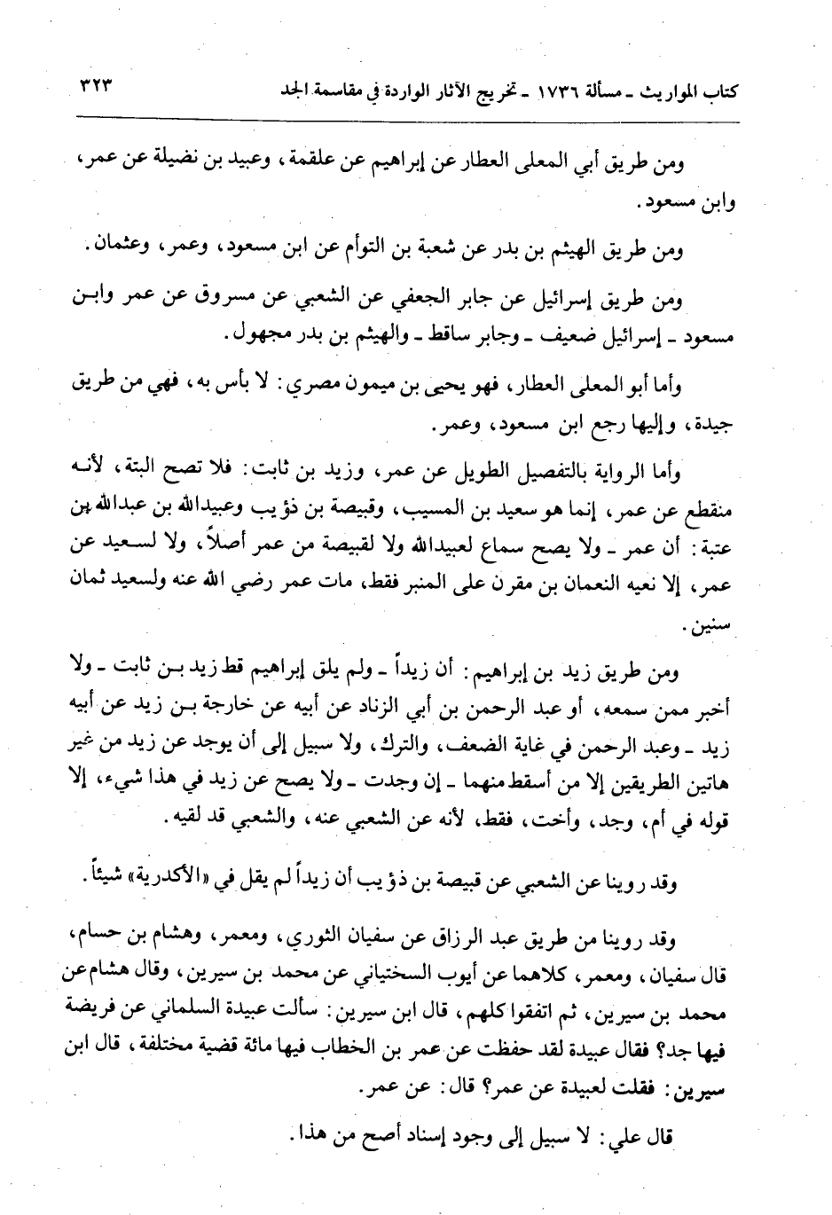 وَمِنْ طَرِيقِ زَيْدِ بْنِ إبْرَاهِيمَ: أَنَّ زَيْدًا - وَلَمْ يَلْقَ إبْرَاهِيمُ قَطُّ زَيْدَ بْنَ ثَابِتٍ - وَلَا أَخْبَرَ مِمَّنْ سَمِعَهُ، أَوْ عَبْدُ الرَّحْمَنِ بْنُ أَبِي الزِّنَادِ عَنْ أَبِيهِ عَنْ خَارِجَةَ بْنِ زَيْدٍ عَنْ أَبِيهِ زَيْدٍ - وَعَبْدُ الرَّحْمَنِ فِي غَايَةِ الضَّعْفِ، وَالتَّرْكِ، وَلَا سَبِيلَ إلَى أَنْ يُوجَدَ عَنْ زَيْدٍ مِنْ غَيْرِ هَاتَيْنِ الطَّرِيقَيْنِ إلَّا مَنْ أُسْقِطَ مِنْهُمَا - إنْ وُجِدَتْ - وَلَا يَصِحُّ عَنْ زَيْدٍ فِي هَذَا شَيْءٌ، إلَّا قَوْلُهُ فِي أُمٍّ، وَجَدٍّ، وَأُخْتٍ، فَقَطْ، لِأَنَّهُ عَنْ الشَّعْبِيِّ عَنْهُ، وَالشَّعْبِيُّ قَدْ لَقِيَهُ.
