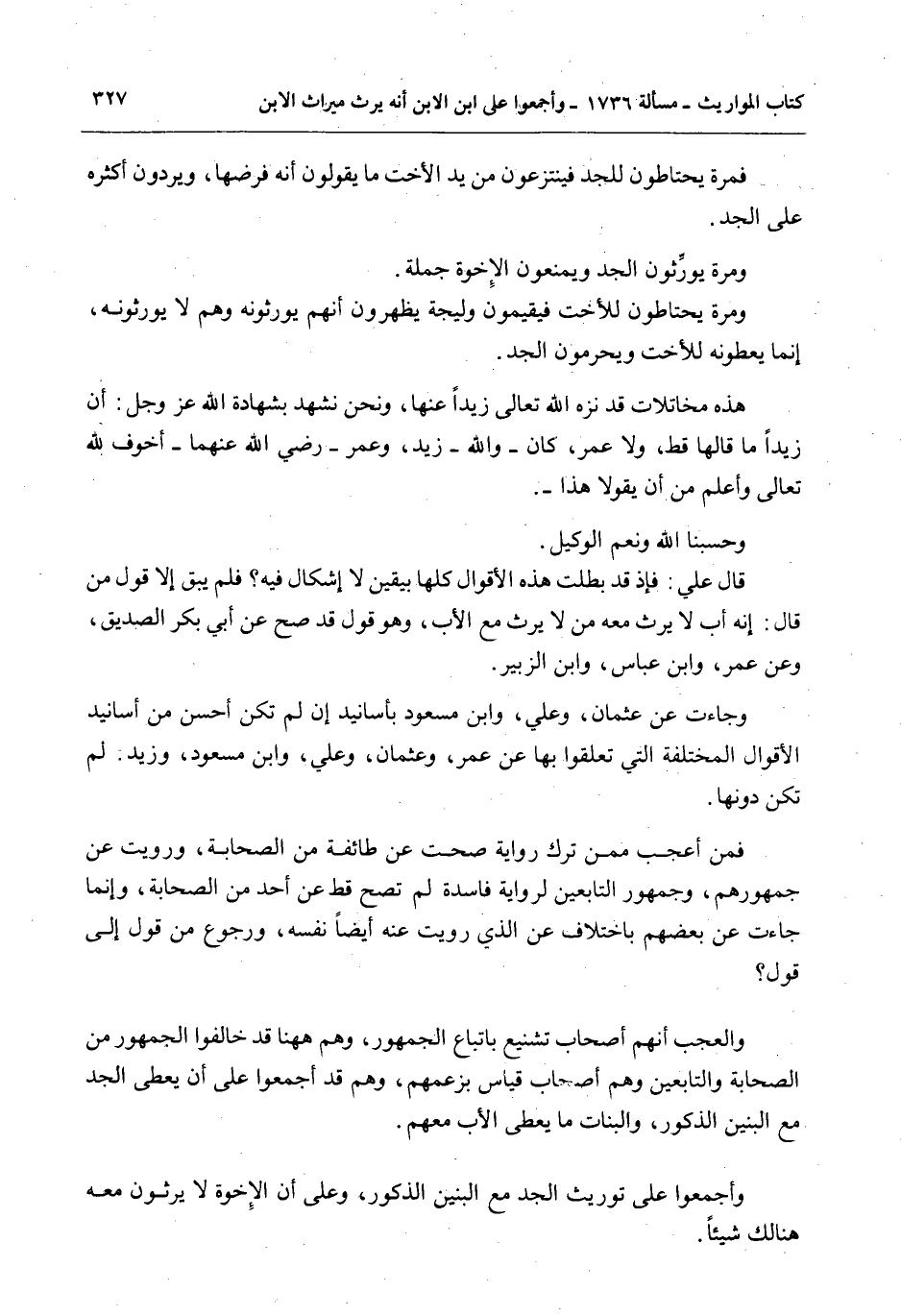 فَمَنْ أَعْجَبُ مِمَّنْ تَرَكَ رِوَايَةً صَحَّتْ عَنْ طَائِفَةٍ مِنْ الصَّحَابَةِ، وَرُوِيَتْ عَنْ جُمْهُورِهِمْ، وَجُمْهُورِ التَّابِعِينَ لِرِوَايَةٍ فَاسِدَةٍ لَمْ تَصِحَّ قَطُّ عَنْ أَحَدٍ مِنْ الصَّحَابَةِ، وَإِنَّمَا جَاءَتْ عَنْ بَعْضِهِمْ بِاخْتِلَافٍ عَنْ الَّذِي رُوِيَتْ عَنْهُ أَيْضًا نَفْسِهِ، وَرُجُوعٍ مِنْ قَوْلٍ إلَى قَوْلٍ؟ وَالْعَجَبُ أَنَّهُمْ أَصْحَابُ تَشْنِيعٍ بِاتِّبَاعِ الْجُمْهُورِ، وَهُمْ هَاهُنَا قَدْ خَالَفُوا الْجُمْهُورَ مِنْ الصَّحَابَةِ وَالتَّابِعِينَ وَهُمْ أَصْحَابُ قِيَاسٍ بِزَعْمِهِمْ، وَهُمْ قَدْ أَجْمَعُوا عَلَى أَنْ يُعْطَى الْجَدُّ مَعَ الْبَنِينَ الذُّكُورِ، وَالْبَنَاتِ مَا يُعْطَى الْأَبُ مَعَهُمْ.