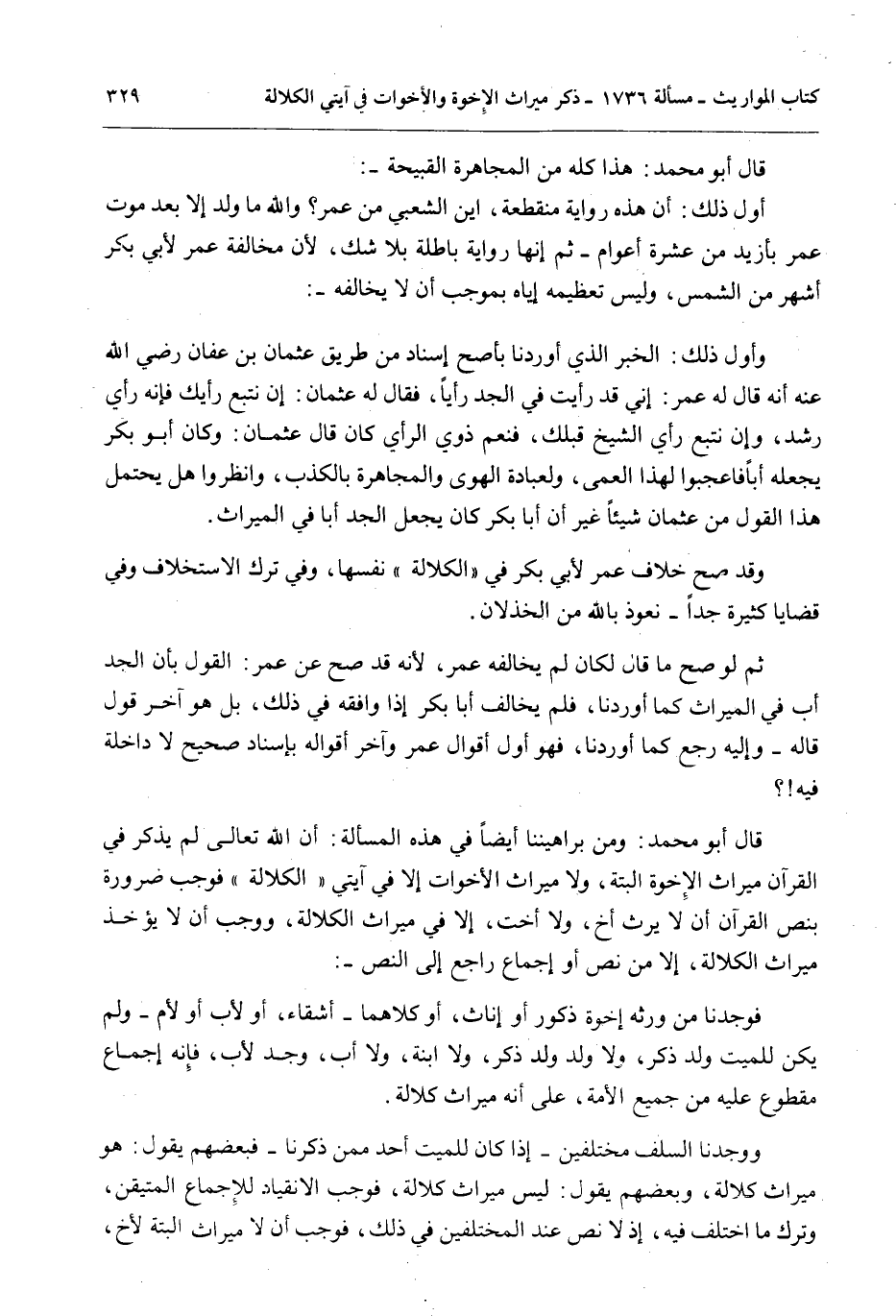 ثُمَّ لَوْ صَحَّ مَا قَالَ لَكَانَ لَمْ يُخَالِفْهُ عُمَرُ؛ لِأَنَّهُ قَدْ صَحَّ عَنْ عُمَرَ: الْقَوْلُ بِأَنَّ الْجَدَّ أَبٌ فِي الْمِيرَاثِ كَمَا أَوْرَدْنَا، فَلَمْ يُخَالِفْ أَبَا بَكْرٍ إذَا وَافَقَهُ فِي ذَلِكَ، بَلْ هُوَ آخِرُ قَوْلٍ قَالَهُ - وَإِلَيْهِ رَجَعَ كَمَا أَوْرَدْنَا، فَهُوَ أَوَّلُ أَقْوَالِ عُمَرَ وَآخِرُ أَقْوَالِهِ بِإِسْنَادٍ صَحِيحٍ لَا دَاخِلَةَ فِيهِ؟ قَالَ أَبُو مُحَمَّدٍ: وَمِنْ بَرَاهِينِنَا أَيْضًا فِي هَذِهِ الْمَسْأَلَةِ: أَنَّ اللَّهَ - تَعَالَى - لَمْ يَذْكُرْ فِي الْقُرْآنِ مِيرَاثَ الْإِخْوَةِ أَلْبَتَّةَ، وَلَا مِيرَاثَ الْأَخَوَاتِ إلَّا فِي آيَتَيْ " الْكَلَالَةِ " فَوَجَبَ ضَرُورَةً بِنَصِّ الْقُرْآنِ أَنْ لَا يَرِثَ أَخٌ، وَلَا أُخْتٌ، إلَّا فِي مِيرَاثِ الْكَلَالَةِ، وَوَجَبَ أَنْ لَا يُؤْخَذَ مِيرَاثُ الْكَلَالَةِ، إلَّا مِنْ نَصٍّ أَوْ إجْمَاعٍ رَاجِعٍ إلَى النَّصِّ -: فَوَجَدْنَا مَنْ وَرِثَهُ إخْوَةٌ ذُكُورٌ أَوْ إنَاثٌ، أَوْ كِلَاهُمَا - أَشِقَّاءُ، أَوْ لِأَبٍ أَوْ لِأُمٍّ - وَلَمْ يَكُنْ لِلْمَيِّتِ وَلَدٌ ذَكَرٌ، وَلَا وَلَدُ وَلَدٍ ذَكَرٌ، وَلَا ابْنَةٌ، وَلَا أَبٌ، وَجَدٌّ لِأَبٍ، فَإِنَّهُ إجْمَاعٌ مَقْطُوعٌ عَلَيْهِ مِنْ جَمِيعِ الْأُمَّةِ، عَلَى أَنَّهُ مِيرَاثُ كَلَالَةٍ.