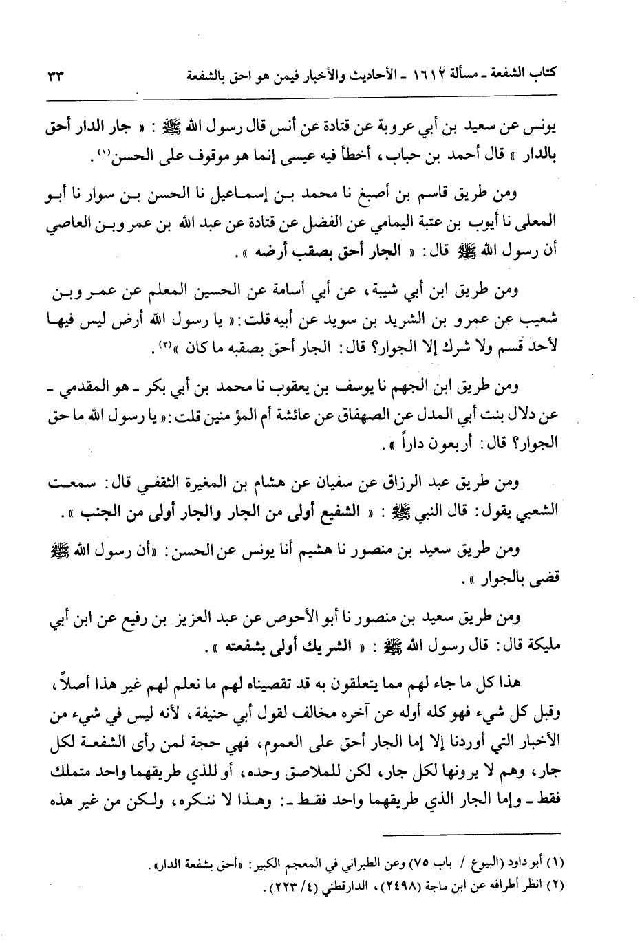 هَذَا كُلُّ مَا جَاءَ لَهُمْ مِمَّا يَتَعَلَّقُونَ بِهِ قَدْ تَقَصَّيْنَاهُ لَهُمْ مَا نَعْلَمُ لَهُمْ غَيْرَ هَذَا أَصْلًا، وَقَبْلَ كُلِّ شَيْءٍ فَهُوَ كُلُّهُ أَوَّلُهُ عَنْ آخِرِهِ مُخَالِفٌ لِقَوْلِ أَبِي حَنِيفَةَ؛ لِأَنَّهُ لَيْسَ فِي شَيْءٍ مِنْ الْأَخْبَارِ الَّتِي أَوْرَدْنَا إلَّا إمَّا الْجَارُ أَحَقُّ عَلَى الْعُمُومِ، فَهِيَ حُجَّةٌ لِمَنْ رَأَى الشُّفْعَةَ لِكُلِّ جَارٍ، وَهُمْ لَا يَرَوْنَهَا لِكُلِّ جَارٍ، لَكِنْ لِلْمُلَاصِقِ وَحْدَهُ، أَوْ لِلَّذِي طَرِيقُهُمَا وَاحِدٌ مُتَمَلَّكٌ فَقَطْ وَإِمَّا الْجَارُ الَّذِي طَرِيقُهُمَا وَاحِدٌ فَقَطْ: وَهَذَا لَا نُنْكِرُهُ، وَلَكِنْ مِنْ غَيْرِ هَذِهِ