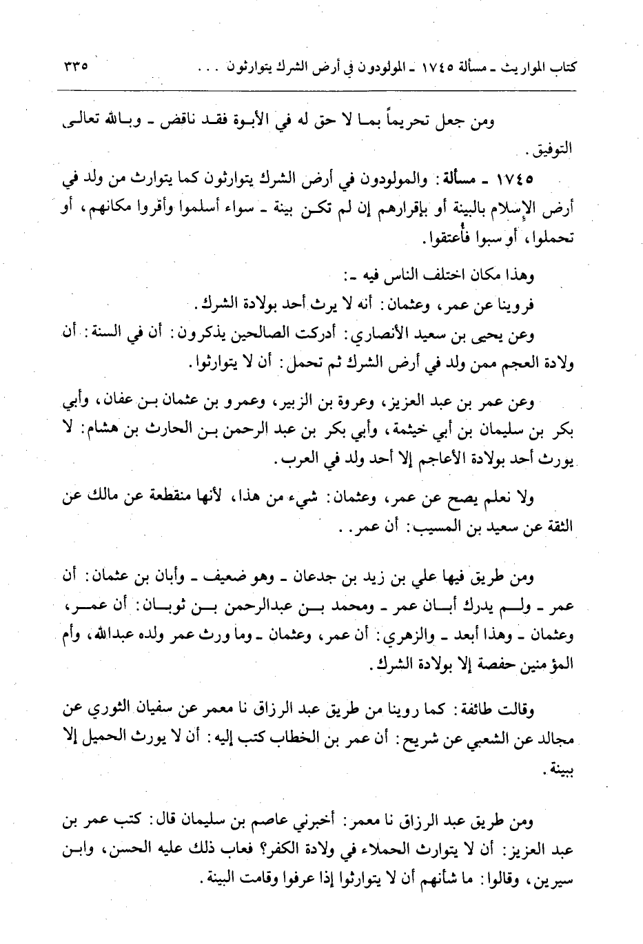 1745 - مَسْأَلَةٌ وَالْمَوْلُودُونَ فِي أَرْضِ الشِّرْكِ يَتَوَارَثُونَ كَمَا يَتَوَارَثُ مَنْ وُلِدَ فِي أَرْضِ الْإِسْلَامِ بِالْبَيِّنَةِ أَوْ بِإِقْرَارِهِمْ إنْ لَمْ تَكُنْ بَيِّنَةٌ - سَوَاءٌ أَسْلَمُوا وَأَقَرُّوا مَكَانَهُمْ، أَوْ تَحَمَّلُوا، أَوْ سُبُوا فَأُعْتِقُوا.