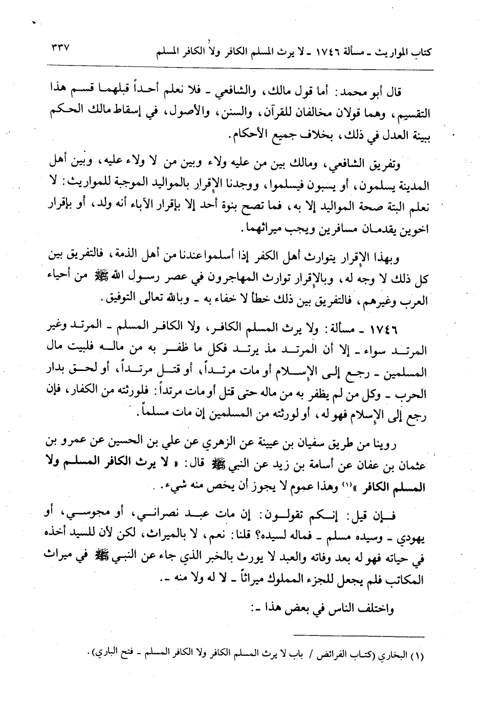 رُوِّينَا مِنْ طَرِيقِ سُفْيَانَ بْنِ عُيَيْنَةَ عَنْ الزُّهْرِيِّ عَنْ عَلِيِّ بْنِ الْحُسَيْنِ عَنْ عَمْرِو بْنِ عُثْمَانَ بْنِ عَفَّانَ عَنْ أُسَامَةَ بْنِ زَيْدٍ عَنْ النَّبِيِّ - صَلَّى اللَّهُ عَلَيْهِ وَسَلَّمَ - قَالَ: «لَا يَرِثُ الْكَافِرُ الْمُسْلِمَ وَلَا الْمُسْلِمُ الْكَافِرَ» وَهَذَا عُمُومٌ لَا يَجُوزُ أَنْ يُخَصَّ مِنْهُ شَيْءٌ.