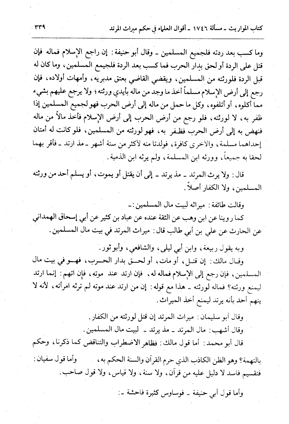 وَقَالَتْ طَائِفَةٌ: مِيرَاثُهُ لِبَيْتِ مَالِ الْمُسْلِمِينَ: - كَمَا رُوِّينَا عَنْ ابْنِ وَهْبٍ عَنْ الثِّقَةِ عِنْدَهُ عَنْ عَبَّادِ بْنِ كَثِيرٍ عَنْ أَبِي إِسْحَاقَ الْهَمْدَانِيِّ عَنْ الْحَارِثِ عَنْ عَلِيِّ بْنِ أَبِي طَالِبٍ قَالَ: مِيرَاثُ الْمُرْتَدِّ فِي بَيْتِ مَالِ الْمُسْلِمِينَ وَبِهِ يَقُولُ رَبِيعَةُ، وَابْنُ أَبِي لَيْلَى، وَالشَّافِعِيُّ، وَأَبُو ثَوْرٍ.