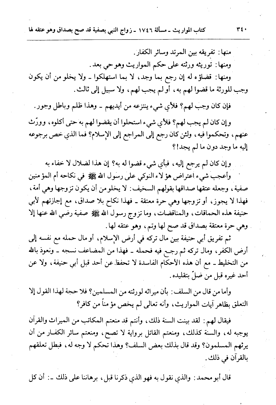 وَإِنْ كَانَ لَمْ يَجِبْ لَهُمْ؟ فَلِأَيِّ شَيْءٍ اسْتَحَلُّوا أَنْ يَقْضُوا لَهُمْ بِهِ حَتَّى أَكَلُوهُ، وَوُرِثَ عَنْهُمْ، وَتَحَكَّمُوا فِيهِ، وَلَئِنْ كَانَ رَجَعَ إلَى الْمُرَاجِعِ إلَى الْإِسْلَامِ؟ فَمَا الَّذِي خُصَّ بِرُجُوعِهِ إلَيْهِ مَا وَجَدَ دُونَ مَا لَمْ يَجِدْ؟ وَإِنْ كَانَ لَمْ يَرْجِعْ إلَيْهِ، فَبِأَيِّ شَيْءٍ قَضَوْا لَهُ بِهِ؟ إنَّ هَذَا لَضَلَالٌ لَا خَفَاءَ بِهِ وَأَعْجَبُ شَيْءٍ اعْتِرَاضُ هَؤُلَاءِ النَّوْكَى عَلَى رَسُولِ اللَّهِ - صَلَّى اللَّهُ عَلَيْهِ وَسَلَّمَ - فِي نِكَاحِهِ أُمَّ الْمُؤْمِنِينَ صَفِيَّةَ، وَجَعْلِهِ عِتْقَهَا صَدَاقَهَا بِقَوْلِهِمْ السَّخِيفِ: لَا يَخْلُو مِنْ أَنْ يَكُونَ تَزَوَّجَهَا وَهِيَ أَمَةٌ، فَهَذَا لَا يَجُوزُ، أَوْ تَزَوَّجَهَا وَهِيَ حُرَّةٌ مُعْتَقَةٌ - فَهَذَا نِكَاحٌ بِلَا صَدَاقٍ، مَعَ إجَازَتِهِمْ لِأَبِي حَنِيفَةَ هَذِهِ الْحَمَاقَاتِ، وَالْمُنَاقَضَاتِ، وَمَا تَزَوَّجَ رَسُولُ اللَّهِ - صَلَّى اللَّهُ عَلَيْهِ وَسَلَّمَ - صَفِيَّةَ - رَضِيَ اللَّهُ عَنْهَا - إلَّا وَهِيَ حُرَّةٌ مُعْتَقَةٌ بِصَدَاقٍ قَدْ صَحَّ لَهَا وَتَمَّ، وَهُوَ عِتْقُهُ لَهَا.