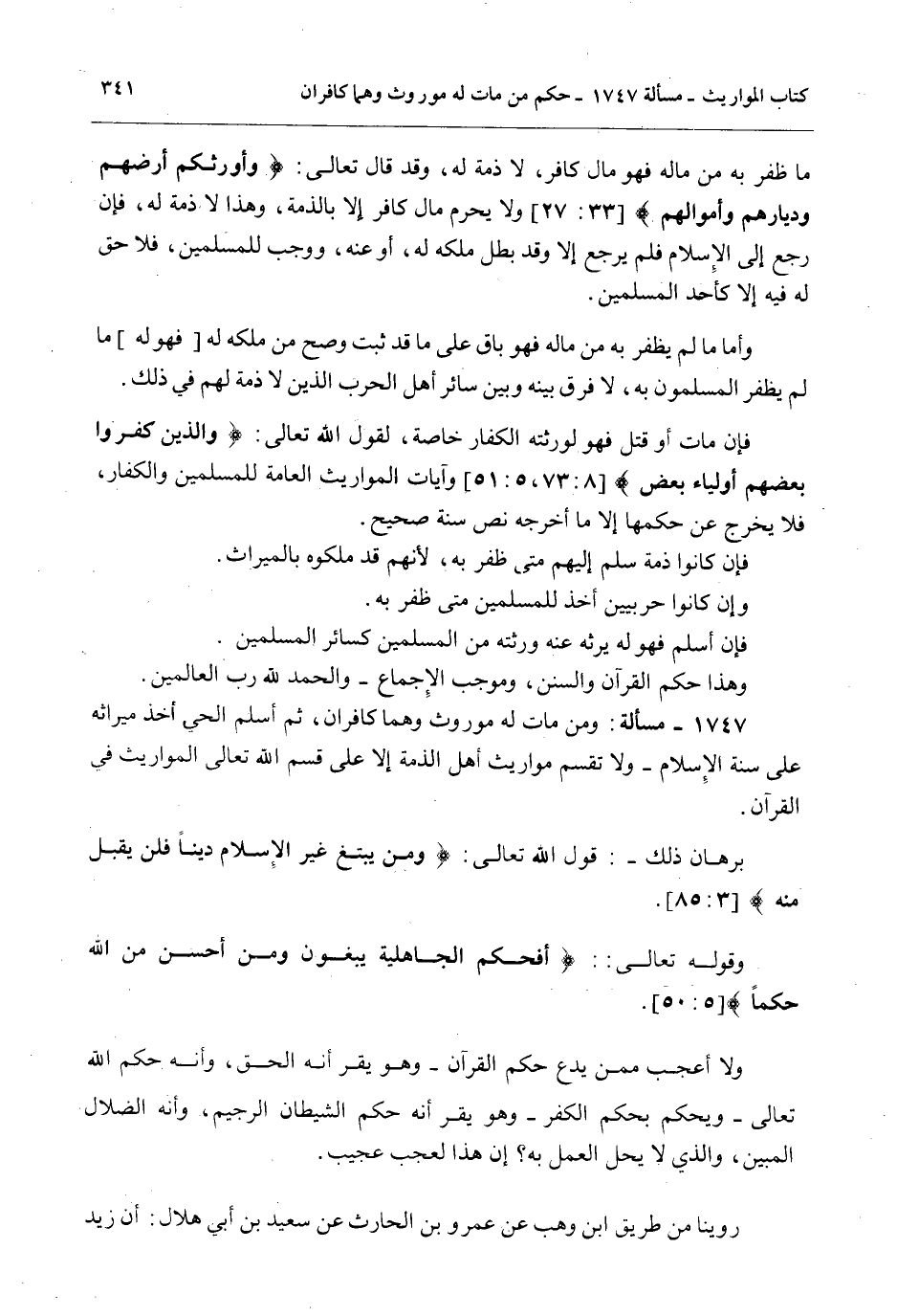 1747 - مَسْأَلَةٌ وَمَنْ مَاتَ لَهُ مَوْرُوثٌ وَهُمَا كَافِرَانِ، ثُمَّ أَسْلَمَ الْحَيُّ أُخِذَ مِيرَاثُهُ عَلَى سُنَّةِ الْإِسْلَامِ - وَلَا تُقَسَّمُ مَوَارِيثُ أَهْلِ الذِّمَّةِ إلَّا عَلَى قَسْمِ اللَّهِ تَعَالَى الْمَوَارِيثَ فِي الْقُرْآنِ.