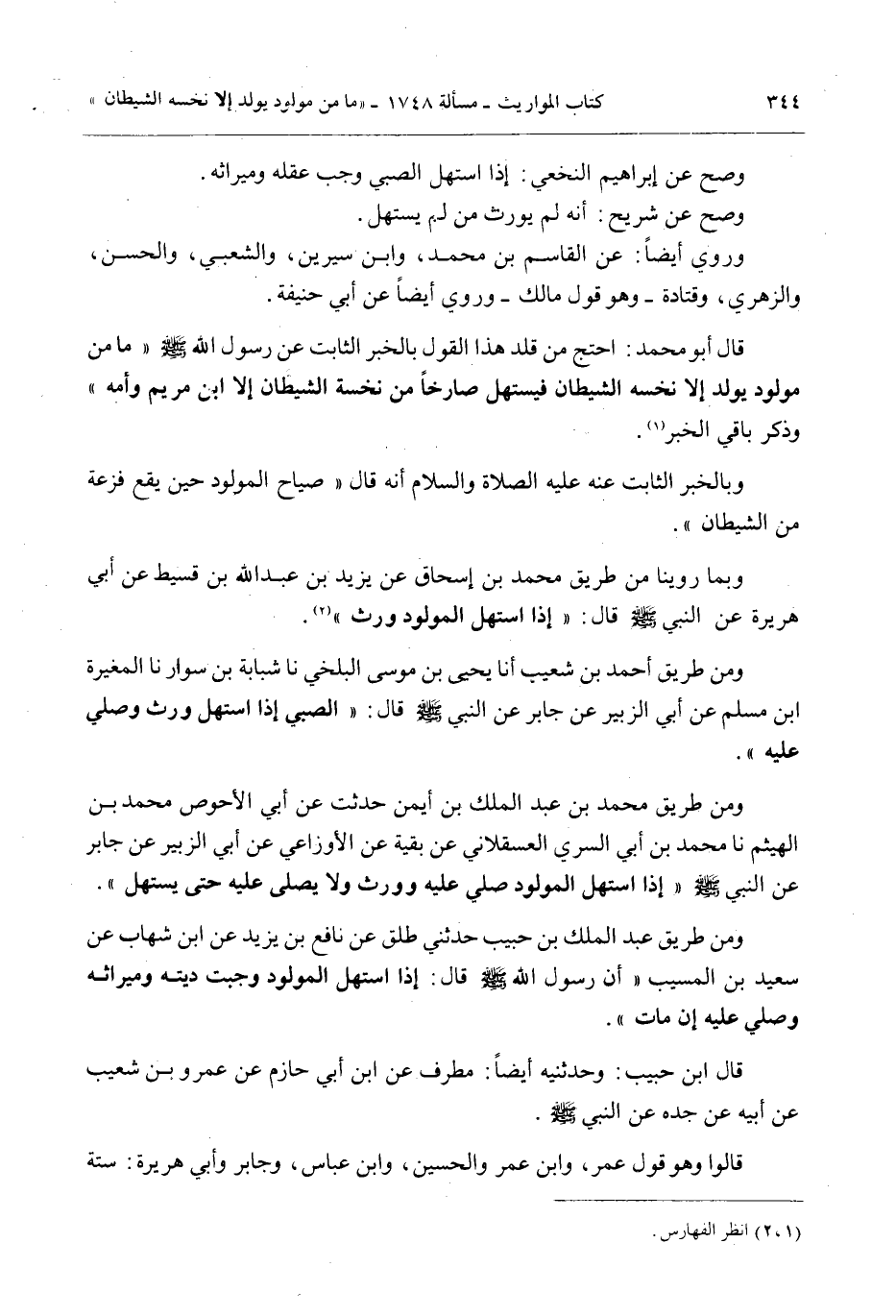وَمِنْ طَرِيقِ أَحْمَدَ بْنِ شُعَيْبٍ أَنَا يَحْيَى بْنُ مُوسَى الْبَلْخِيّ نا شَبَابَةُ بْنُ سَوَّارٍ نا الْمُغِيرَةُ بْنُ مُسْلِمٍ عَنْ أَبِي الزُّبَيْرِ عَنْ جَابِرٍ عَنْ النَّبِيِّ - صَلَّى اللَّهُ عَلَيْهِ وَسَلَّمَ - قَالَ: «الصَّبِيُّ إذَا اسْتَهَلَّ وَرِثَ وَصُلِّيَ عَلَيْهِ» .