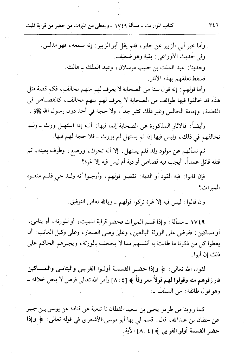 1749 - مَسْأَلَةٌ وَإِذَا قُسِّمَ الْمِيرَاثُ فَحَضَرَ قَرَابَةٌ لِلْمَيِّتِ، أَوْ لِلْوَرَثَةِ، أَوْ يَتَامَى، أَوْ مَسَاكِينُ: فَفُرِضَ عَلَى الْوَرَثَةِ الْبَالِغِينَ، وَعَلَى وَصِيِّ الصِّغَارِ، وَعَلَى وَكِيلِ الْغَائِبِ: أَنْ يُعْطُوا كُلَّ مَنْ ذَكَرْنَا مَا طَابَتْ بِهِ أَنْفُسُهُمْ مِمَّا لَا يُجْحِفُ بِالْوَرَثَةِ، وَيُجْبِرُهُمْ الْحَاكِمُ عَلَى ذَلِكَ إنْ أَبَوْا.
