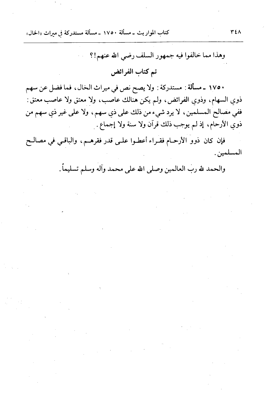 وَهَذَا مِمَّا خَالَفُوا فِيهِ جُمْهُورَ السَّلَفِ - رَضِيَ اللَّهُ عَنْهُمْ -؟ تَمَّ كِتَابُ الْفَرَائِضِ.