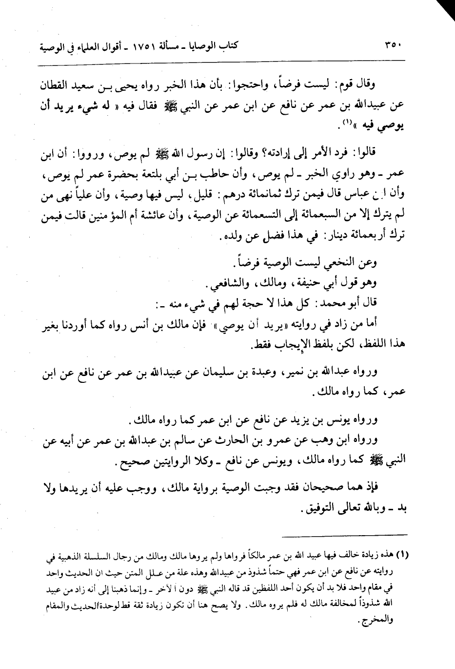قَالَ أَبُو مُحَمَّدٍ: كُلُّ هَذَا لَا حُجَّةَ لَهُمْ فِي شَيْءٍ مِنْهُ -: أَمَّا مَنْ زَادَ فِي رِوَايَتِهِ " يُرِيدُ أَنْ يُوصِيَ " فَإِنَّ مَالِكَ بْنَ أَنَسٍ رَوَاهُ كَمَا أَوْرَدْنَا بِغَيْرِ هَذَا اللَّفْظِ، لَكِنْ بِلَفْظِ الْإِيجَابِ فَقَطْ.