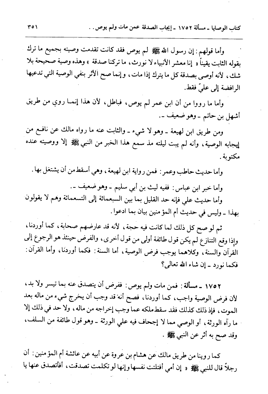 وَأَمَّا قَوْلُهُمْ: إنَّ رَسُولَ اللَّهِ - صَلَّى اللَّهُ عَلَيْهِ وَسَلَّمَ - لَمْ يُوصِ فَقَدْ كَانَتْ تَقَدَّمَتْ وَصِيَّتُهُ بِجَمِيعِ مَا تَرَكَ بِقَوْلِهِ الثَّابِتِ يَقِينًا «إنَّا مَعْشَرَ الْأَنْبِيَاءِ لَا نُوَرَّثُ، مَا تَرَكْنَا صَدَقَةٌ» وَهَذِهِ وَصِيَّةٌ صَحِيحَةٌ بِلَا شَكٍّ، لِأَنَّهُ أَوْصَى بِصَدَقَةِ كُلِّ مَا يَتْرُكُ إذَا مَاتَ، وَإِنَّمَا صَحَّ الْأَثَرُ بِنَفْيِ الْوَصِيَّةِ الَّتِي تَدَّعِيهَا الرَّافِضَةُ إلَى عَلِيٍّ فَقَطْ.