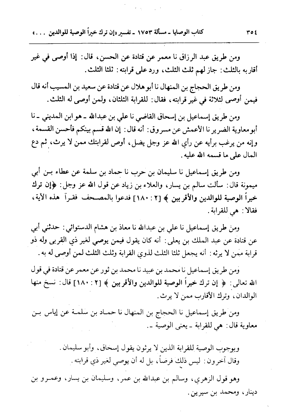 وَمِنْ طَرِيقِ إسْمَاعِيلَ نا مُحَمَّدُ بْنُ عُبَيْدٍ نا مُحَمَّدُ بْنُ ثَوْرٍ عَنْ مَعْمَرٍ عَنْ قَتَادَةَ فِي قَوْلِ اللَّهِ تَعَالَى: {إِنْ تَرَكَ خَيْرًا الْوَصِيَّةُ لِلْوَالِدَيْنِ وَالأَقْرَبِينَ} [البقرة: 180] قَالَ: نُسِخَ مِنْهَا الْوَالِدَانِ، وَتُرِكَ الْأَقَارِبُ مِمَّنْ لَا يَرِثُ.