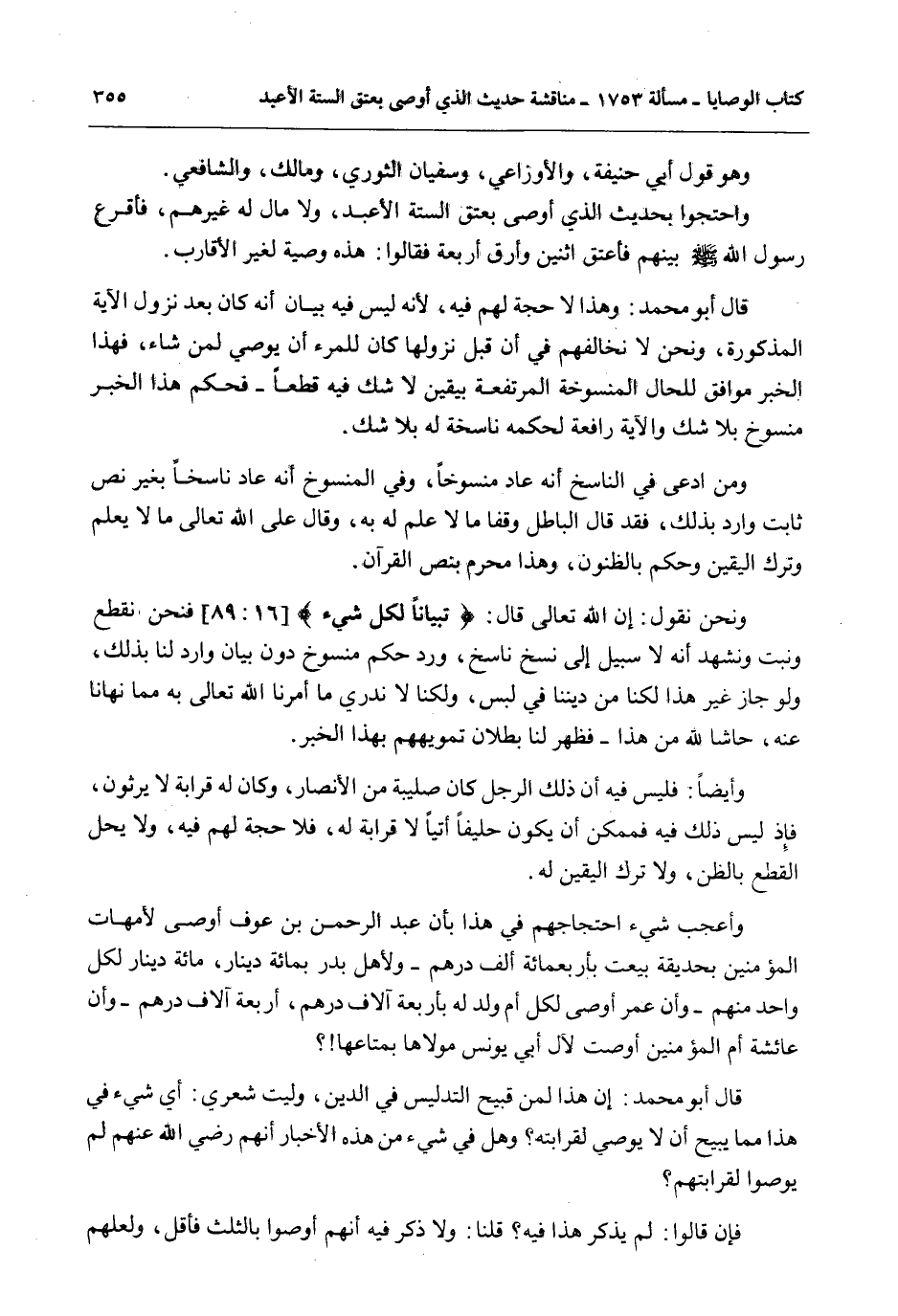 قَالَ أَبُو مُحَمَّدٍ: وَهَذَا لَا حُجَّةَ لَهُمْ فِيهِ؛ لِأَنَّهُ لَيْسَ فِيهِ بَيَانُ أَنَّهُ كَانَ بَعْدَ نُزُولِ الْآيَةِ الْمَذْكُورَةِ، وَنَحْنُ لَا نُخَالِفُهُمْ فِي أَنَّ قَبْلَ نُزُولِهَا كَانَ لِلْمَرْءِ أَنْ يُوصِيَ لِمَنْ شَاءَ، فَهَذَا الْخَبَرُ مُوَافِقٌ لِلْحَالِ الْمَنْسُوخَةِ الْمُرْتَفِعَةِ بِيَقِينٍ لَا شَكَّ فِيهِ قَطْعًا - فَحُكْمُ هَذَا الْخَبَرِ مَنْسُوخٌ بِلَا شَكٍّ وَالْآيَةُ رَافِعَةٌ لِحُكْمِهِ نَاسِخَةٌ لَهُ بِلَا شَكٍّ.