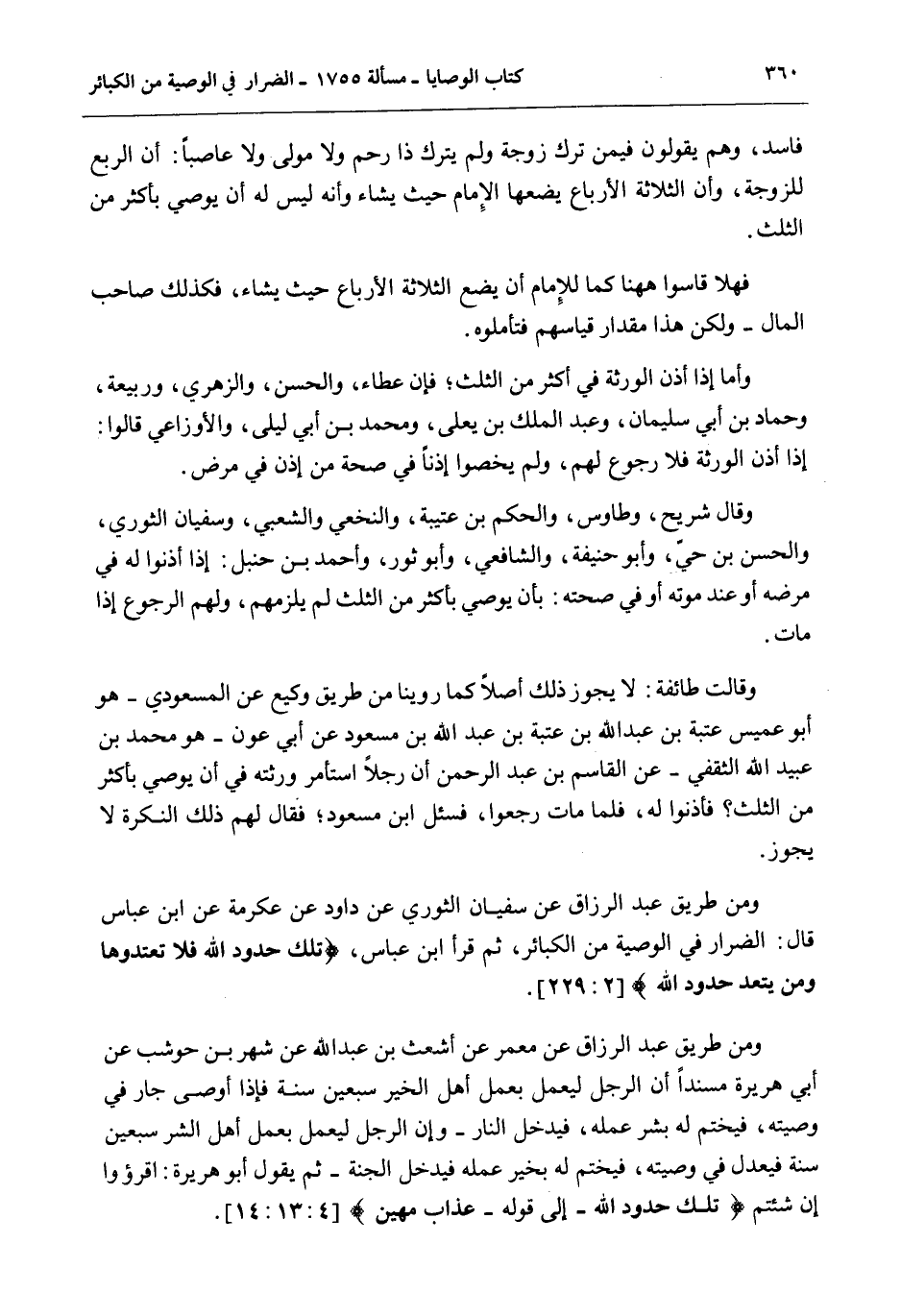 وَمِنْ طَرِيقِ عَبْدِ الرَّزَّاقِ عَنْ سُفْيَانَ الثَّوْرِيِّ عَنْ دَاوُد عَنْ عِكْرِمَةَ عَنْ ابْنِ عَبَّاسٍ قَالَ: الضِّرَارُ فِي الْوَصِيَّةِ مِنْ الْكَبَائِرِ، ثُمَّ قَرَأَ ابْنُ عَبَّاسٍ، {تِلْكَ حُدُودُ اللَّهِ فَلا تَعْتَدُوهَا وَمَنْ يَتَعَدَّ حُدُودَ اللَّهِ} [البقرة: 229] .