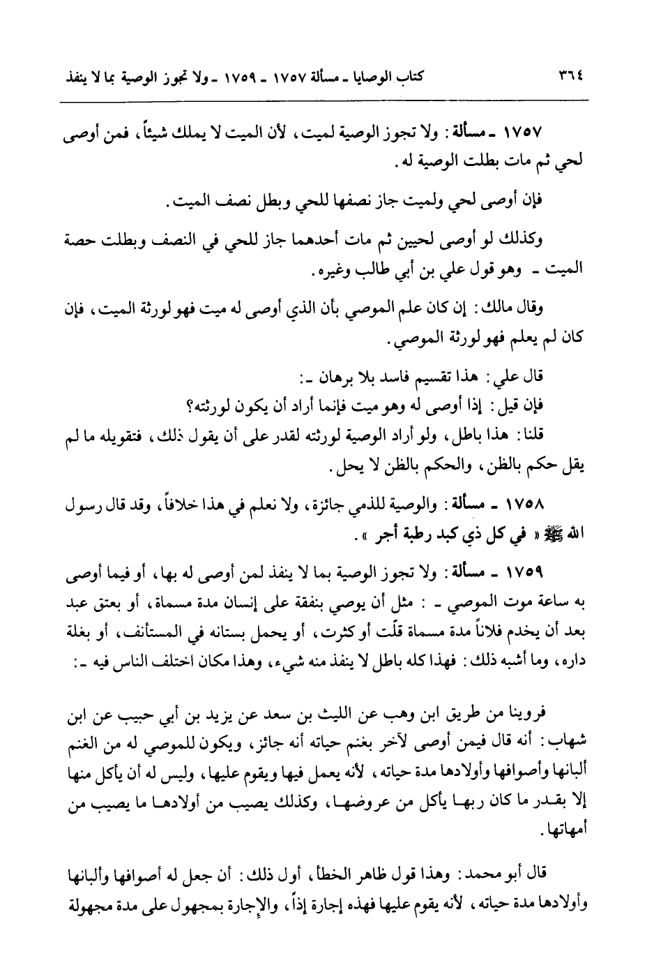 1759 - مَسْأَلَةٌ: وَلَا تَجُوزُ الْوَصِيَّةُ بِمَا لَا يُنَفَّذُ لِمَنْ أَوْصَى لَهُ بِهَا، أَوْ فِيمَا أَوْصَى بِهِ سَاعَةَ مَوْتِ الْمُوصِي -: مِثْلُ أَنْ يُوصِيَ بِنَفَقَةٍ عَلَى إنْسَانٍ مُدَّةً مُسَمَّاةً، أَوْ بِعِتْقِ عَبْدٍ بَعْدَ أَنْ يَخْدُمَ فُلَانًا مُدَّةً مُسَمَّاةً قَلَّتْ أَوْ كَثُرَتْ، أَوْ يَحْمِلُ بُسْتَانَه فِي الْمُسْتَأْنَفِ، أَوْ بَغْلَةَ دَارِهِ، وَمَا أَشْبَهَ ذَلِكَ: فَهَذَا كُلُّهُ بَاطِلٌ لَا يُنَفَّذُ مِنْهُ شَيْءٌ، وَهَذَا مَكَانٌ اخْتَلَفَ النَّاسُ فِيهِ -: فَرُوِّينَا مِنْ طَرِيقِ ابْنِ وَهْبٍ عَنْ اللَّيْثِ بْنِ سَعْدٍ عَنْ يَزِيدَ بْنِ أَبِي حَبِيبٍ عَنْ ابْنِ شِهَابٍ: أَنَّهُ قَالَ فِيمَنْ أَوْصَى لِآخَرَ بِغَنَمٍ حَيَاتَهُ أَنَّهُ جَائِزٌ، وَيَكُونُ لِلْمُوصِي لَهُ مِنْ الْغَنَمِ أَلْبَانُهَا وَأَصْوَافُهَا وَأَوْلَادُهَا مُدَّةَ حَيَاتِهِ؛ لِأَنَّهُ يَعْمَلُ فِيهَا وَيَقُومُ عَلَيْهَا، وَلَيْسَ لَهُ أَنْ يَأْكُلَ مِنْهَا إلَّا بِقَدْرِ مَا كَانَ رَبُّهَا يَأْكُلُ مِنْ عُرُوضِهَا، وَكَذَلِكَ يُصِيبُ مِنْ أَوْلَادِهَا مَا يُصِيبُ مِنْ أُمَّهَاتِهَا.