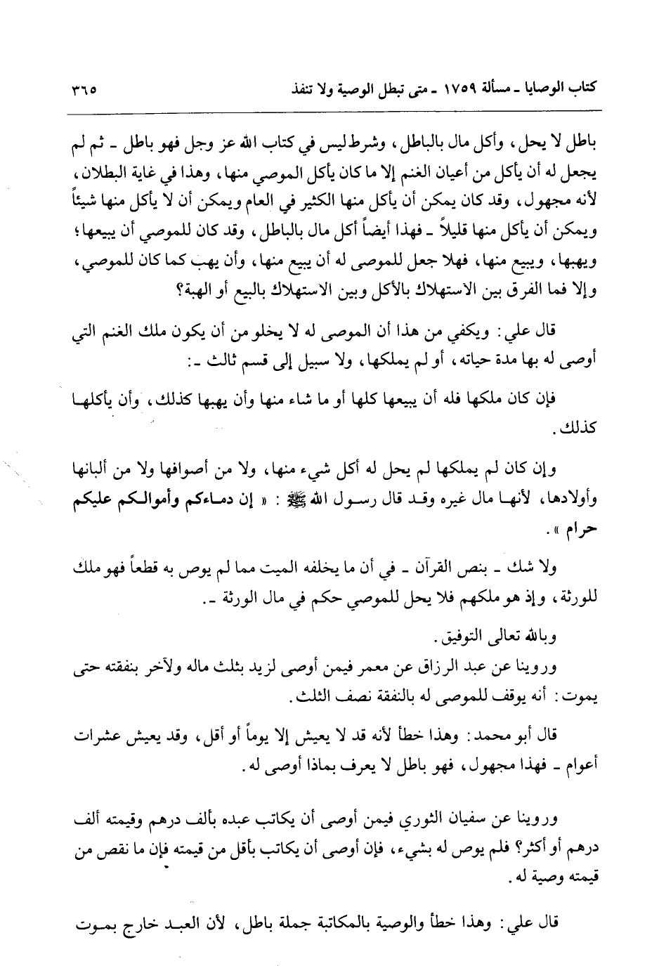 بَاطِلٌ لَا يَحِلُّ، وَأَكْلُ مَالٍ بِالْبَاطِلِ، وَشَرْطٌ لَيْسَ فِي كِتَابِ اللَّهِ عَزَّ وَجَلَّ فَهُوَ بَاطِلٌ - ثُمَّ لَمْ يَجْعَلْ لَهُ أَنْ يَأْكُلَ مِنْ أَعْيَانِ الْغَنَمِ إلَّا مَا كَانَ يَأْكُلُ الْمُوصِي مِنْهَا، وَهَذَا فِي غَايَةِ الْبُطْلَانِ؛ لِأَنَّهُ مَجْهُولٌ، وَقَدْ كَانَ يُمْكِنُ أَنْ يَأْكُلَ مِنْهَا الْكَثِيرَ فِي الْعَامِ وَيُمْكِنُ أَنْ لَا يَأْكُلَ مِنْهَا شَيْئًا وَيُمْكِنُ أَنْ يَأْكُلَ مِنْهَا قَلِيلًا - فَهَذَا أَيْضًا أَكْلُ مَالٍ بِالْبَاطِلِ، وَقَدْ كَانَ لِلْمُوصِي أَنْ يَبِيعَهَا؛ وَيَهَبَهَا، وَيَبِيعَ مِنْهَا، فَهَلَّا جَعَلَ لِلْمُوصَى لَهُ أَنْ يَبِيعَ مِنْهَا، وَأَنْ يَهَبَ كَمَا كَانَ لِلْمُوصِي، وَإِلَّا فَمَا الْفَرْقُ بَيْنَ الِاسْتِهْلَاكِ بِالْأَكْلِ وَبَيْنَ الِاسْتِهْلَاكِ بِالْبَيْعِ أَوْ الْهِبَةِ؟ قَالَ عَلِيٌّ: وَيَكْفِي مِنْ هَذَا أَنَّ الْمُوصَى لَهُ لَا يَخْلُو مِنْ أَنْ يَكُونَ مَلَكَ الْغَنَمَ الَّتِي أَوْصَى لَهُ بِهَا مُدَّةَ حَيَاتِهِ، أَوْ لَمْ يَمْلِكْهَا، وَلَا سَبِيلَ إلَى قِسْمٍ ثَالِثٍ -: فَإِنْ كَانَ مَلَكَهَا فَلَهُ أَنْ يَبِيعَهَا كُلَّهَا أَوْ مَا شَاءَ مِنْهَا وَأَنْ يَهَبَهَا كَذَلِكَ، وَأَنْ يَأْكُلَهَا كَذَلِكَ.