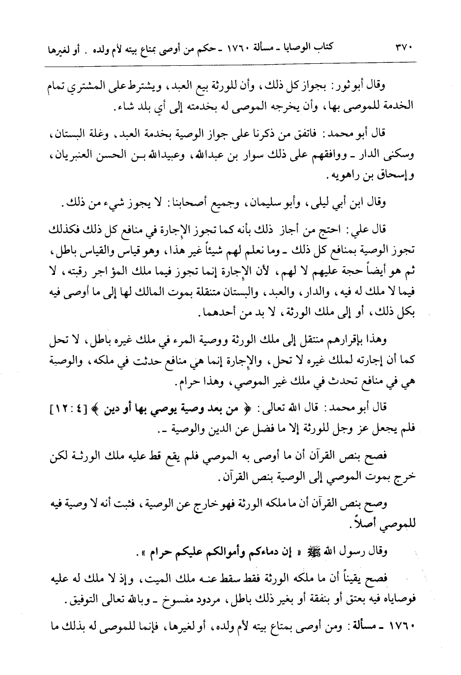 قَالَ أَبُو مُحَمَّدٍ: فَاتَّفَقَ مَنْ ذَكَرْنَا عَلَى جَوَازِ الْوَصِيَّةِ بِخِدْمَةِ الْعَبْدِ، وَغَلَّةِ الْبُسْتَانِ، وَسُكْنَى الدَّارِ - وَوَافَقَهُمْ عَلَى ذَلِكَ سَوَّارُ بْنُ عَبْدِ اللَّهِ، وَعُبَيْدُ اللَّهِ بْنُ الْحَسَنِ الْعَنْبَرِيَّانِ، وَإِسْحَاقُ بْنُ رَاهْوَيْهِ.