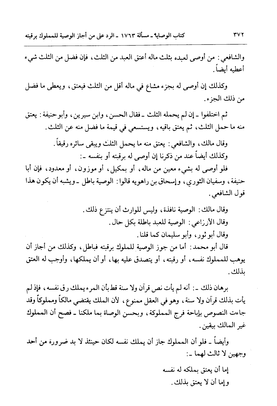 وَكَذَلِكَ أَيْضًا عِنْدَ مَنْ ذَكَرْنَا إنْ أَوْصَى لَهُ بِرَقَبَتِهِ أَوْ بِنَفْسِهِ -: فَلَوْ أَوْصَى لَهُ بِشَيْءٍ مُعَيَّنٍ مِنْ مَالِهِ، أَوْ بِمَكِيلٍ، أَوْ مَوْزُونٍ، أَوْ مَعْدُودٍ، فَإِنَّ أَبَا حَنِيفَةَ، وَسُفْيَانَ الثَّوْرِيَّ، وَإِسْحَاقَ بْنَ رَاهْوَيْهِ قَالُوا: الْوَصِيَّةُ بَاطِلٌ - وَيُشْبِهُ أَنْ يَكُونَ هَذَا قَوْلَ الشَّافِعِيِّ.
