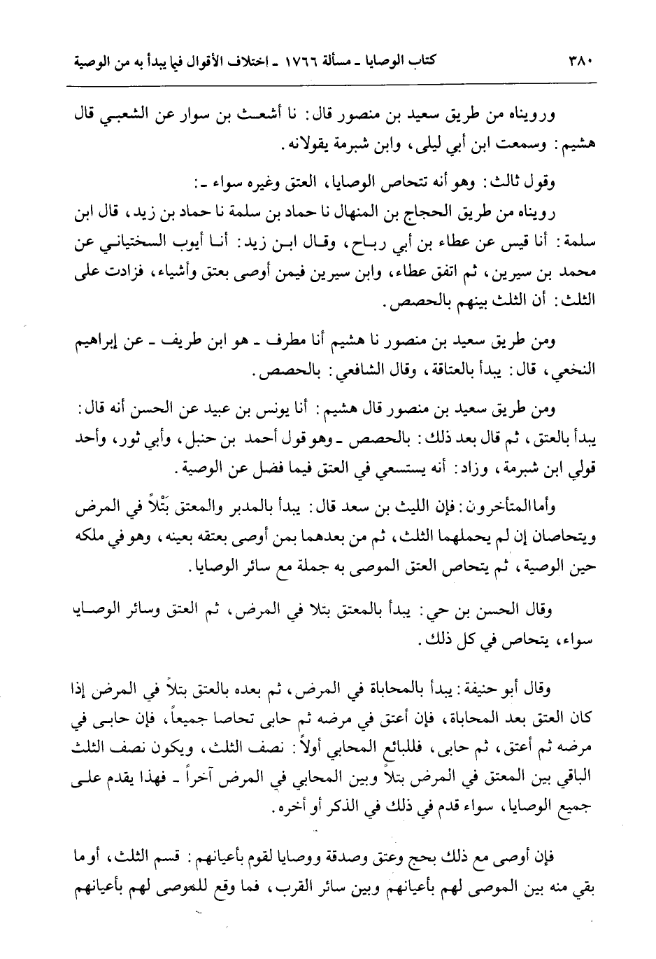 وَمِنْ طَرِيقِ سَعِيدِ بْنِ مَنْصُورٍ نا هُشَيْمٌ نا مُطَرِّفٌ - هُوَ ابْنُ طَرِيفٍ - عَنْ إبْرَاهِيمَ النَّخَعِيِّ، قَالَ: يُبْدَأُ بِالْعَتَاقَةِ، وَقَالَ الشَّافِعِيُّ: بِالْحِصَصِ.