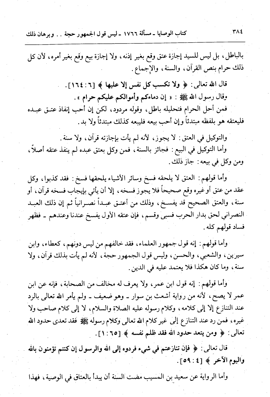 وَأَمَّا قَوْلُهُمْ: إنَّهُ قَوْلُ جُمْهُورِ الْعُلَمَاءِ، فَقَدْ خَالَفَهُمْ مَنْ لَيْسَ دُونَهُمْ، كَعَطَاءٍ، وَابْنِ سِيرِينَ، وَالشَّعْبِيِّ، وَالْحَسَنِ، وَلَيْسَ قَوْلُ الْجُمْهُورِ حُجَّةً؛ لِأَنَّهُ لَمْ يَأْتِ بِذَلِكَ قُرْآنٌ، وَلَا سُنَّةٌ، وَمَا كَانَ هَكَذَا فَلَا يُعْتَمَدُ عَلَيْهِ فِي الدِّينِ.