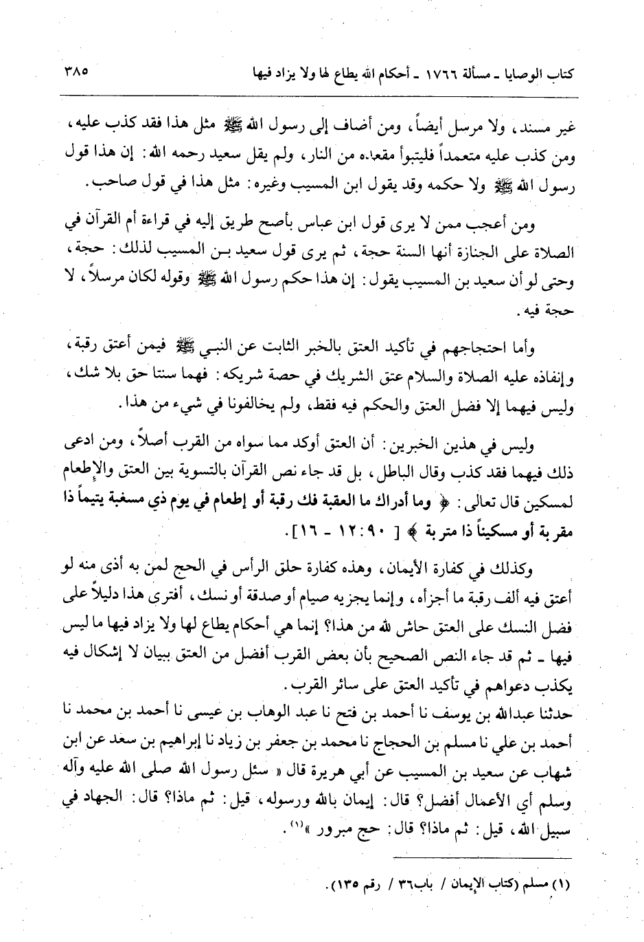 وَكَذَلِكَ فِي كَفَّارَةِ الْأَيْمَانِ، وَهَذِهِ كَفَّارَةُ حَلْقِ الرَّأْسِ فِي الْحَجِّ لِمَنْ بِهِ أَذًى مِنْهُ لَوْ أَعْتَقَ فِيهِ أَلْفَ رَقَبَةٍ مَا أَجْزَأَهُ، وَإِنَّمَا يُجْزِيهِ صِيَامٌ أَوْ صَدَقَةٌ أَوْ نُسُكٌ، أَفَتَرَى هَذَا دَلِيلًا عَلَى فَضْلِ النُّسُكِ عَلَى الْعِتْقِ حَاشَ لِلَّهِ مِنْ هَذَا؟ إنَّمَا هِيَ أَحْكَامٌ يُطَاعُ لَهَا وَلَا يُزَادُ فِيهَا مَا لَيْسَ فِيهَا - ثُمَّ قَدْ جَاءَ النَّصُّ الصَّحِيحُ بِأَنَّ بَعْضَ الْقُرَبِ أَفْضَلُ مِنْ الْعِتْقِ بِبَيَانٍ لَا إشْكَالَ فِيهِ يُكَذِّبُ دَعْوَاهُمْ فِي تَأْكِيدِ الْعِتْقِ عَلَى سَائِرِ الْقُرَبِ.