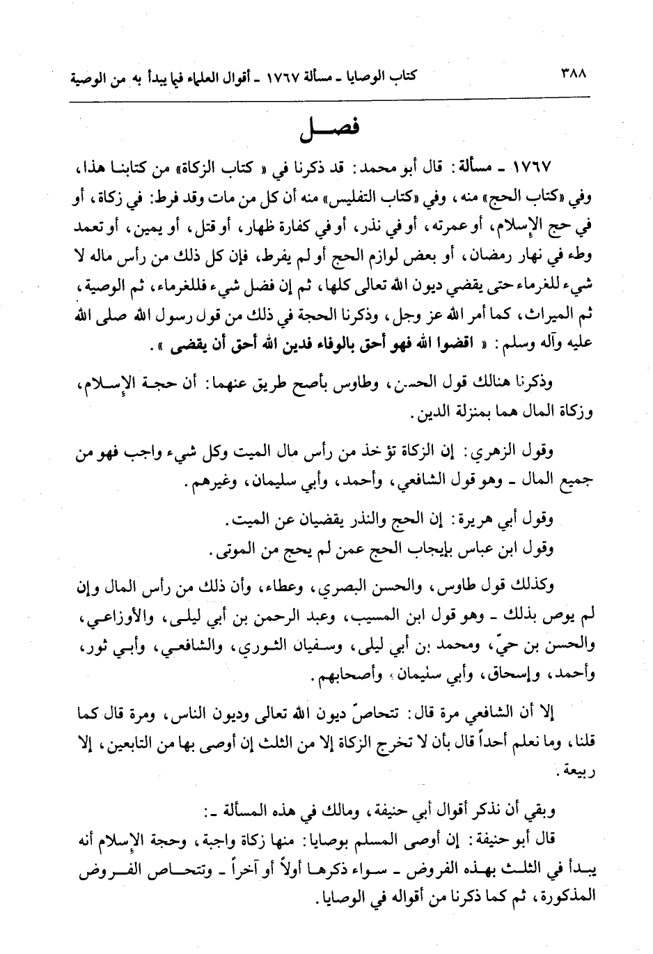 فَصْلٌ 1767 - مَسْأَلَةٌ: قَالَ أَبُو مُحَمَّدٍ: قَدْ ذَكَرْنَا فِي " كِتَابِ الزَّكَاةِ " مِنْ كِتَابِنَا هَذَا، وَفِي " كِتَابِ الْحَجِّ " مِنْهُ، وَفِي " كِتَابِ التَّفْلِيسِ " مِنْهُ أَنَّ كُلَّ مَنْ مَاتَ وَقَدْ فَرَّطَ: فِي زَكَاةٍ، أَوْ فِي حَجِّ الْإِسْلَامِ، أَوْ عُمْرَتِهِ، أَوْ فِي نَذْرٍ، أَوْ فِي كَفَّارَةِ ظِهَارٍ، أَوْ قَتْلٍ، أَوْ يَمِينٍ، أَوْ تَعَمَّدَ وَطْءً فِي نَهَارِ رَمَضَانَ، أَوْ بَعْضَ لَوَازِمِ الْحَجِّ أَوْ لَمْ يُفَرِّطْ، فَإِنَّ كُلَّ ذَلِكَ مِنْ رَأْسِ مَالِهِ لَا شَيْءَ لِلْغُرَمَاءِ حَتَّى يَقْضِيَ دُيُونَ اللَّهِ تَعَالَى كُلَّهَا، ثُمَّ إنْ فَضَلَ شَيْءٌ فَلِلْغُرَمَاءِ، ثُمَّ الْوَصِيَّةُ، ثُمَّ الْمِيرَاثُ، كَمَا أَمَرَ اللَّهُ عَزَّ وَجَلَّ، وَذَكَرْنَا الْحُجَّةَ فِي ذَلِكَ مِنْ قَوْلِ رَسُولِ اللَّهِ - صَلَّى اللَّهُ عَلَيْهِ وَآلِهِ وَسَلَّمَ - «اقْضُوا اللَّهَ فَهُوَ أَحَقُّ بِالْوَفَاءِ فَدَيْنُ اللَّهِ أَحَقُّ أَنْ يُقْضَى» .