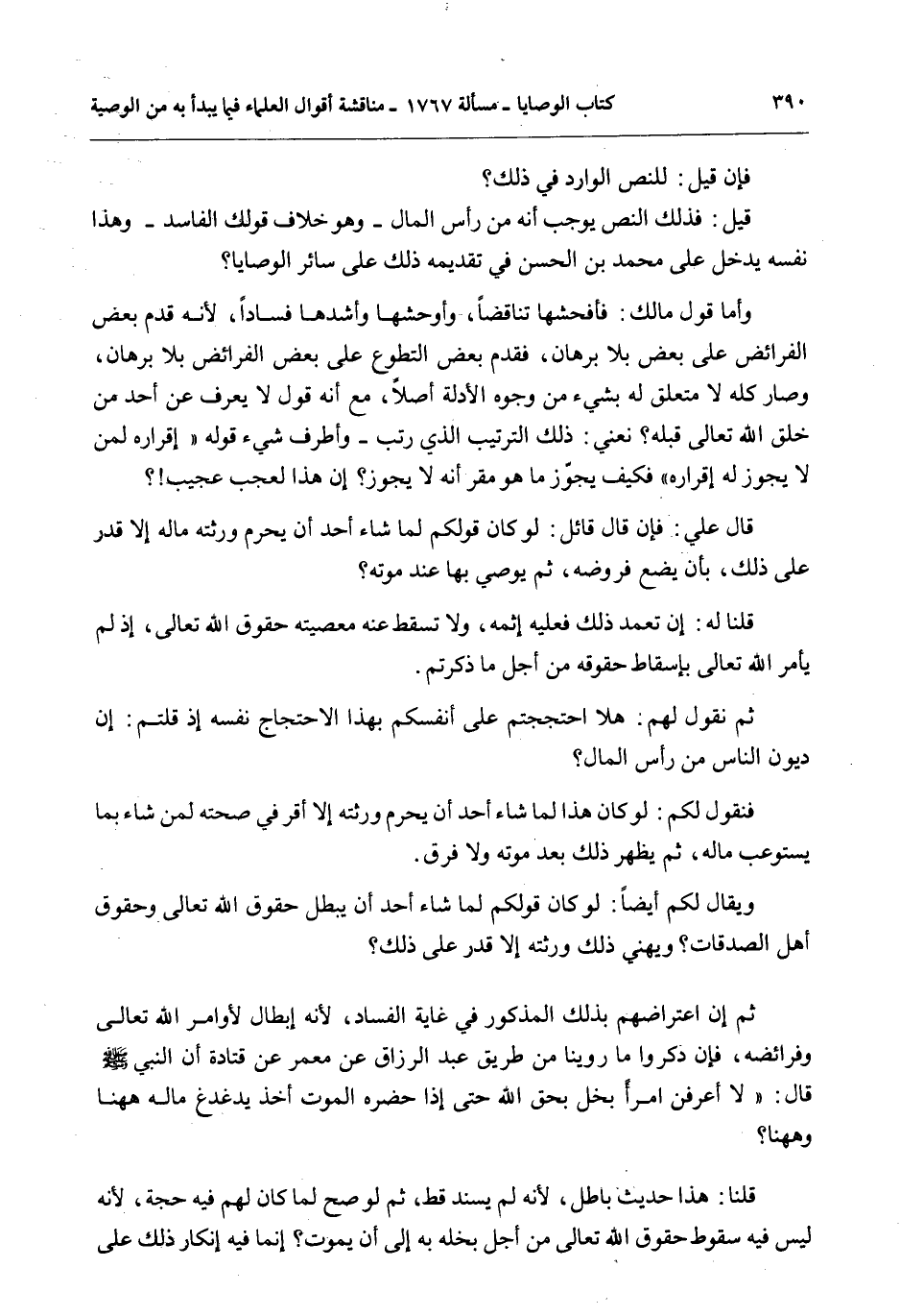 فَإِنْ قِيلَ: لِلنَّصِّ الْوَارِدِ فِي ذَلِكَ؟ قِيلَ: فَذَلِكَ النَّصُّ يُوجِبُ أَنَّهُ مِنْ رَأْسِ الْمَالِ - وَهُوَ خِلَافُ قَوْلِك الْفَاسِدِ - وَهَذَا نَفْسُهُ يَدْخُلُ عَلَى مُحَمَّدِ بْنِ الْحَسَنِ فِي تَقْدِيمِهِ ذَلِكَ عَلَى سَائِرِ الْوَصَايَا؟ وَأَمَّا قَوْلُ مَالك: فَأَفْحَشُهَا تَنَاقُضًا، وَأَوْحَشُهَا وَأَشَدُّهَا فَسَادًا؛ لِأَنَّهُ قَدَّمَ بَعْضَ الْفَرَائِضِ عَلَى بَعْضٍ بِلَا بُرْهَانٍ، فَقَدَّمَ بَعْضَ التَّطَوُّعِ عَلَى بَعْضِ الْفَرَائِضِ بِلَا بُرْهَانٍ، وَصَارَ كُلُّهُ لَا مُتَعَلِّقَ لَهُ بِشَيْءٍ مِنْ وُجُوهِ الْأَدِلَّةِ أَصْلًا، مَعَ أَنَّهُ قَوْلٌ لَا يُعْرَفُ عَنْ أَحَدٍ مِنْ خَلْقِ اللَّهِ تَعَالَى قَبْلَهُ؟ نَعْنِي: ذَلِكَ التَّرْتِيبَ الَّذِي رَتَّبَ - وَأَطْرَفُ شَيْءٍ قَوْلُهُ " إقْرَارُهُ لِمَنْ لَا يَجُوزُ لَهُ إقْرَارُهُ " فَكَيْفَ يَجُوزُ مَا هُوَ مُقِرٌّ أَنَّهُ لَا يَجُوزُ؟ إنَّ هَذَا لَعَجَبٌ عَجِيبٌ؟ قَالَ عَلِيٌّ: فَإِنْ قَالَ قَائِلٌ: لَوْ كَانَ قَوْلُكُمْ لَمَا شَاءَ أَحَدٌ أَنْ يَحْرِمَ وَرَثَتَهُ مَالَهُ إلَّا قَدَرَ عَلَى ذَلِكَ، بِأَنْ يَضَعَ فُرُوضَهُ، ثُمَّ يُوصِيَ بِهَا عِنْدَ مَوْتِهِ؟ قُلْنَا لَهُ: إنْ تَعَمَّدَ ذَلِكَ فَعَلَيْهِ إثْمُهُ، وَلَا تُسْقِطُ عَنْهُ مَعْصِيَتُهُ حُقُوقَ اللَّهِ تَعَالَى؛ إذْ لَمْ يَأْمُرْ اللَّهُ تَعَالَى بِإِسْقَاطِ حُقُوقِهِ مِنْ أَجْلِ مَا ذَكَرْتُمْ.