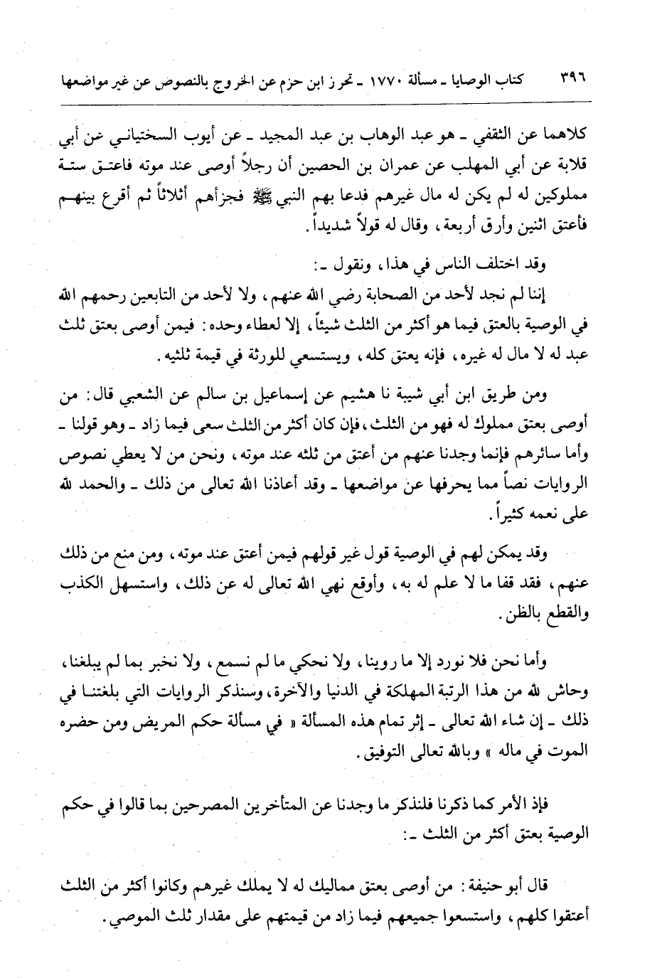 وَمِنْ طَرِيقِ ابْنِ أَبِي شَيْبَةَ أَنَا هُشَيْمٌ عَنْ إسْمَاعِيلَ بْنِ سَالِمٍ عَنْ الشَّعْبِيِّ قَالَ: مَنْ أَوْصَى بِعِتْقِ مَمْلُوكٍ لَهُ فَهُوَ مِنْ الثُّلُثِ، فَإِنْ كَانَ أَكْثَرَ مِنْ الثُّلُثِ سَعَى فِيمَا زَادَ - وَهُوَ قَوْلُنَا - وَأَمَّا سَائِرُهُمْ فَإِنَّمَا وَجَدْنَا عَنْهُمْ مَنْ أَعْتَقَ مِنْ ثُلُثِهِ عِنْدَ مَوْتِهِ، وَنَحْنُ مَنْ لَا يُعْطِي نُصُوصَ الرِّوَايَاتِ نَصًّا مِمَّا يُحَرِّفُهَا عَنْ مَوَاضِعِهَا - وَقَدْ أَعَاذَنَا اللَّهُ تَعَالَى مِنْ ذَلِكَ - وَالْحَمْدُ لِلَّهِ عَلَى نِعَمِهِ كَثِيرًا.