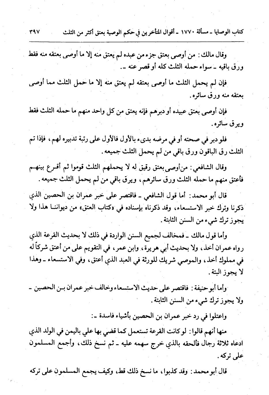وَأَمَّا قَوْلُ مَالِكٍ - فَمُخَالِفٌ لِجَمِيعِ السُّنَنِ الْوَارِدَةِ فِي ذَلِكَ لَا بِحَدِيثِ الْقُرْعَةِ الَّذِي رَوَاهُ عِمْرَانُ أَخَذَ، وَلَا بِحَدِيثِ أَبِي هُرَيْرَةَ، وَابْنِ عُمَرَ، فِي التَّقْوِيمِ عَلَى مَنْ أَعْتَقَ شِرْكًا لَهُ فِي مَمْلُوكٍ أَخَذَ، وَالْمُوصِي شَرِيكٌ لِلْوَرَثَةِ فِي الْعَبْدِ الَّذِي أُعْتِقَ، وَفِي الِاسْتِسْعَاءِ - وَهَذَا لَا يَجُوزُ أَلْبَتَّةَ.