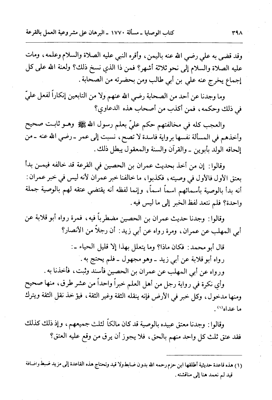 وَقَالُوا: إنَّ مَنْ أَخَذَ بِحَدِيثِ عِمْرَانَ بْنِ الْحُصَيْنِ فِي الْقُرْعَةِ قَدْ خَالَفَهُ فِيمَنْ بَدَأَ بِعِتْقِ الْأَوَّلِ فَالْأَوَّلِ فِي وَصِيَّتِهِ، فَكَذَبُوا، مَا خَالَفْنَا خَبَرَ عِمْرَانَ لِأَنَّهُ لَيْسَ فِي خَبَرِ عِمْرَانَ: أَنَّهُ بَدَأَ بِالْوَصِيَّةِ بِأَسْمَائِهِمْ اسْمًا اسْمًا، وَإِنَّمَا لَفْظُهُ أَنَّهُ يَقْتَضِي عِتْقَهُ لَهُمْ بِالْوَصِيَّةِ جُمْلَةً وَاحِدَةً؟ فَلَمْ نَتَعَدَّ لَفْظَ الْخَبَرِ إلَى مَا لَيْسَ فِيهِ.