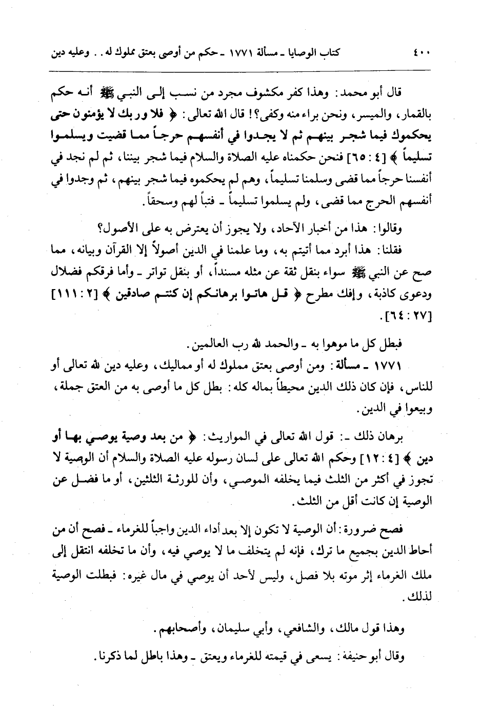1771 - مَسْأَلَةٌ: وَمَنْ أَوْصَى بِعِتْقِ مَمْلُوكٍ لَهُ أَوْ مَمَالِيكَ، وَعَلَيْهِ دَيْنٌ لِلَّهِ تَعَالَى أَوْ لِلنَّاسِ، فَإِنْ كَانَ ذَلِكَ الدَّيْنُ مُحِيطًا بِمَالِهِ كُلِّهِ: بَطَلَ كُلُّ مَا أَوْصَى بِهِ مِنْ الْعِتْقِ جُمْلَةً، وَبِيعُوا فِي الدَّيْنِ.