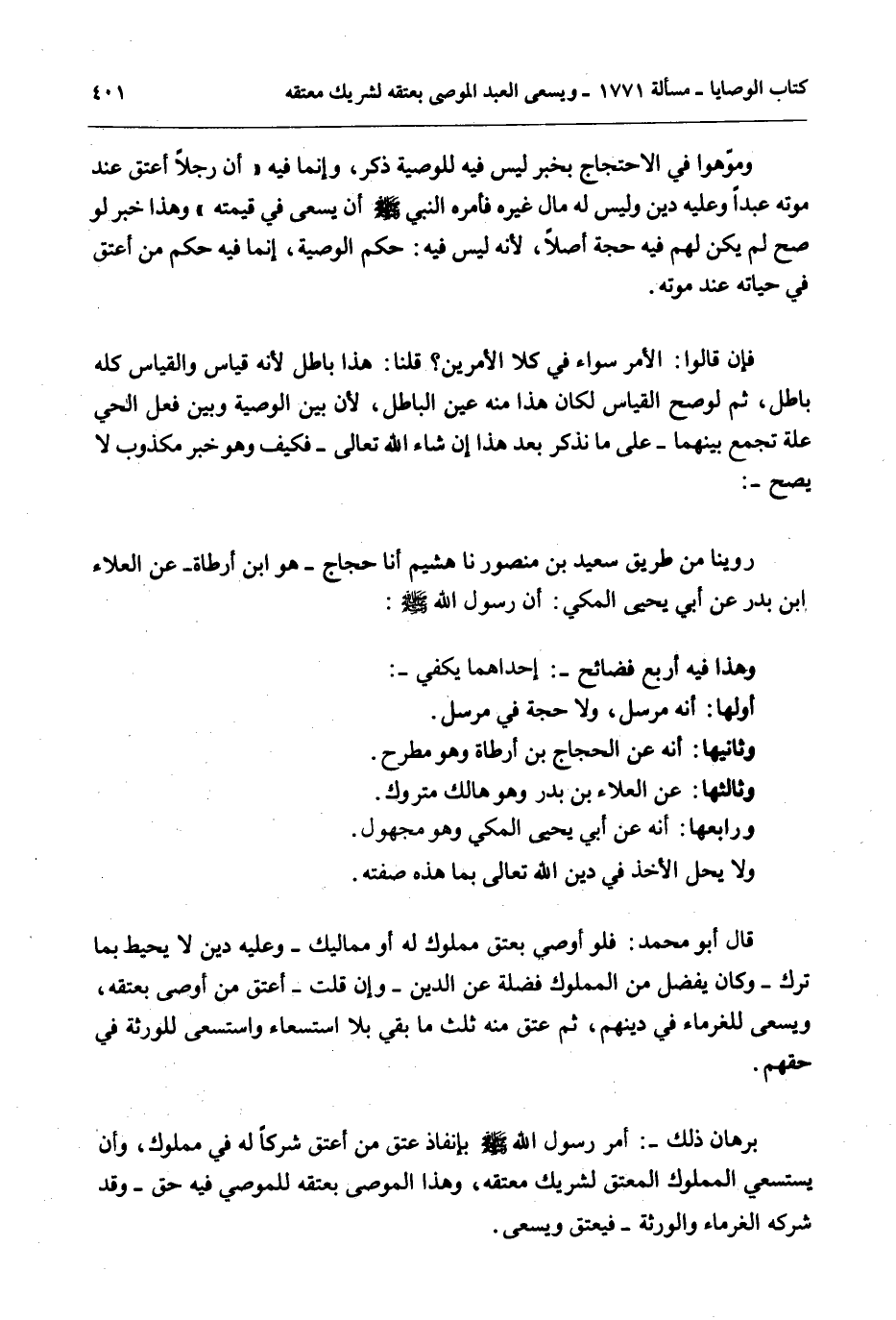 فَإِنْ قَالُوا: الْأَمْرُ سَوَاءٌ فِي كِلَا الْأَمْرَيْنِ؟ قُلْنَا: هَذَا بَاطِلٌ لِأَنَّهُ قِيَاسٌ وَالْقِيَاسُ كُلُّهُ بَاطِلٌ، ثُمَّ لَوْ صَحَّ الْقِيَاسُ لَكَانَ هَذَا مِنْهُ عَيْنَ الْبَاطِلِ؛ لِأَنَّ بَيْنَ الْوَصِيَّةِ وَبَيْنَ فِعْلِ الْحَيِّ عِلَّةً تَجْمَعُ بَيْنَهُمَا - عَلَى مَا نَذْكُرُ بَعْدَ هَذَا إنْ شَاءَ اللَّهُ تَعَالَى - فَكَيْفَ وَهُوَ خَبَرٌ مَكْذُوبٌ لَا يَصِحُّ -: رُوِّينَا مِنْ طَرِيقِ سَعِيدِ بْنِ مَنْصُورٍ نا هُشَيْمٌ أَنَا حَجَّاجٌ - هُوَ ابْنُ أَرْطَاةَ - عَنْ الْعَلَاءِ بْنِ بَدْرٍ عَنْ أَبِي يَحْيَى الْمَكِّيِّ: أَنَّ رَسُولَ اللَّهِ - صَلَّى اللَّهُ عَلَيْهِ وَسَلَّمَ -: وَهَذَا فِيهِ أَرْبَعُ فَضَائِحَ -: إحْدَاهَا يَكْفِي -: