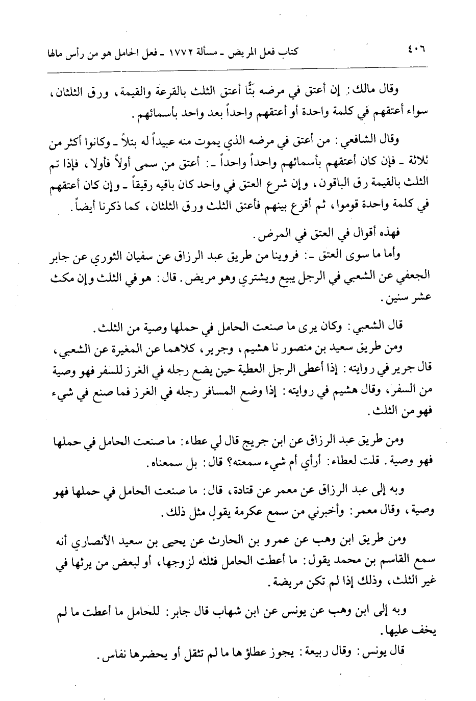 وَأَمَّا مَا سِوَى الْعِتْقِ -: فَرُوِّينَا مِنْ طَرِيقِ عَبْدِ الرَّزَّاقِ عَنْ سُفْيَانَ الثَّوْرِيِّ عَنْ جَابِرٍ الْجُعْفِيِّ عَنْ الشَّعْبِيِّ فِي الرَّجُلِ يَبِيعُ وَيَشْتَرِي وَهُوَ مَرِيضٌ قَالَ: هُوَ فِي الثُّلُثِ وَإِنْ مَكَثَ عَشْرَ سِنِينَ.