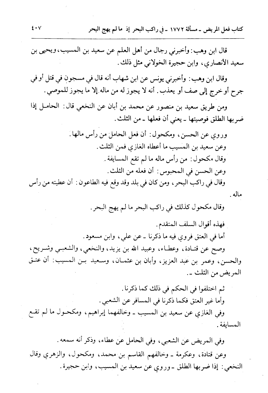 قَالَ ابْنُ وَهْبٍ: وَأَخْبَرَنِي رِجَالٌ مِنْ أَهْلِ الْعِلْمِ عَنْ سَعِيدِ بْنِ الْمُسَيِّبِ، وَيَحْيَى بْنِ سَعِيدٍ الْأَنْصَارِيِّ، وَابْنِ حُجَيْرَةَ الْخَوْلَانِيِّ مِثْلَ ذَلِكَ. وَقَالَ ابْنُ وَهْبٍ: وَأَخْبَرَنِي يُونُسُ عَنْ ابْنِ شِهَابٍ أَنَّهُ قَالَ فِي مَسْجُونٍ فِي قَتْلٍ أَوْ فِي جُرْحٍ أَوْ خَرَجَ إلَى صَفٍّ أَوْ يُعَذَّبُ. أَنَّهُ لَا يَجُوزُ لَهُ مِنْ مَالِهِ إلَّا مَا يَجُوزُ لِلْمُوصِي.