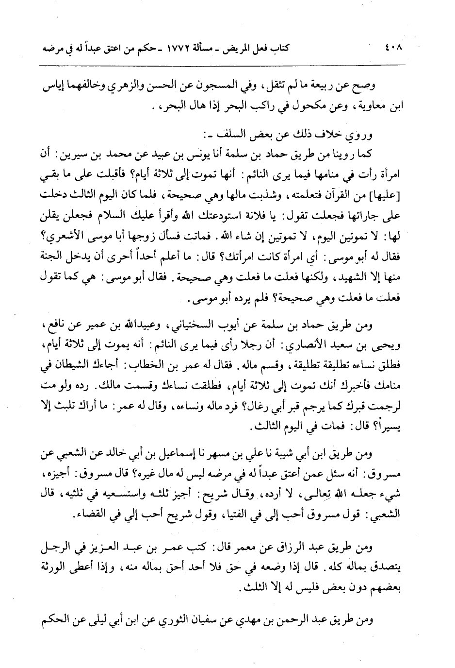 وَمِنْ طَرِيقِ ابْنِ أَبِي شَيْبَةَ نا عَلِيُّ بْنُ مُسْهِرٍ نا إسْمَاعِيلُ بْنُ أَبِي خَالِدٍ عَنْ الشَّعْبِيِّ عَنْ مَسْرُوقٍ: أَنَّهُ سُئِلَ عَمَّنْ أَعْتَقَ عَبْدًا لِلَّهِ فِي مَرَضِهِ لَيْسَ لَهُ مَالٌ غَيْرُهُ؟ قَالَ مَسْرُوقٌ: أُجِيزُهُ، شَيْءٌ جَعَلَهُ اللَّهُ تَعَالَى، لَا أَرُدُّهُ، وَقَالَ شُرَيْحٌ: أُجِيزُ ثُلُثَهُ وَاسْتَسْعِيهِ فِي ثُلُثَيْهِ، قَالَ الشَّعْبِيُّ: قَوْلُ مَسْرُوقٍ أَحَبُّ إلَيَّ فِي الْفُتْيَا، وَقَوْلُ شُرَيْحٍ أَحَبُّ إلَيَّ فِي الْقَضَاءِ.