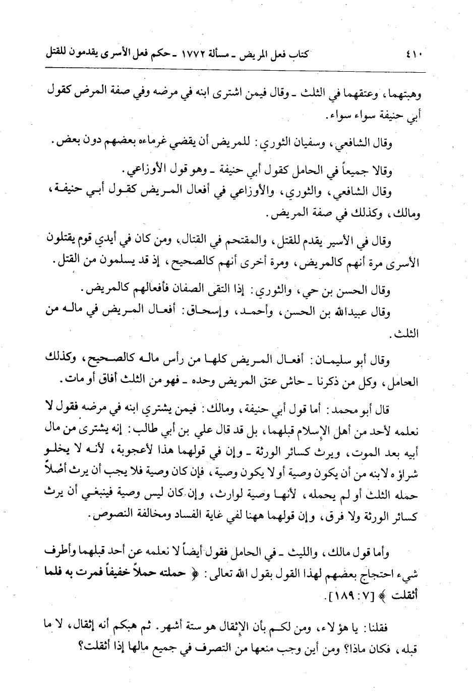 وَقَالَ فِي الْأَسِيرِ يُقَدَّمُ لِلْقَتْلِ، وَالْمُقْتَحِمِ فِي الْقِتَالِ، وَمَنْ كَانَ فِي أَيْدِي قَوْمٍ يَقْتُلُونَ الْأَسْرَى مَرَّةً أَنَّهُمْ كَالْمَرِيضِ، وَمَرَّةً أُخْرَى أَنَّهُمْ كَالصَّحِيحِ، إذْ قَدْ يَسْلَمُونَ مِنْ الْقَتْلِ.