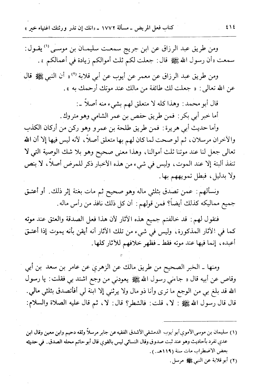 وَمِنْهَا - الْخَبَرُ الصَّحِيحُ مِنْ طَرِيقِ مَالِكٍ عَنْ الزُّهْرِيِّ عَنْ «عَامِرِ بْنِ سَعْدِ بْنِ أَبِي وَقَّاصٍ عَنْ أَبِيهِ قَالَ جَاءَنِي رَسُولُ اللَّهِ - صَلَّى اللَّهُ عَلَيْهِ وَسَلَّمَ - يَعُودُنِي مِنْ وَجَعٍ اشْتَدَّ بِي فَقُلْتُ: يَا رَسُولَ اللَّهِ قَدْ بَلَغَ بِي مِنْ الْوَجَعِ مَا تَرَى وَأَنَا ذُو مَالٍ وَلَا يَرِثُنِي إلَّا ابْنَةٌ لِي أَفَأَتَصَدَّقُ بِثُلُثَيْ مَالِي. قَالَ قَالَ رَسُولُ اللَّهِ - صَلَّى اللَّهُ عَلَيْهِ وَسَلَّمَ -: لَا، قُلْت: فَالشَّطْرُ؟ قَالَ: لَا، ثُمَّ قَالَ - عَلَيْهِ الصَّلَاةُ وَالسَّلَامُ -:
