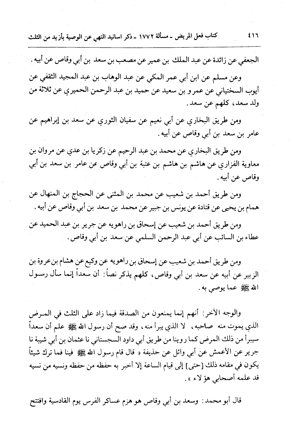 وَمِنْ طَرِيقِ أَحْمَدَ بْنِ شُعَيْبٍ عَنْ إِسْحَاقَ بْنِ رَاهْوَيْهِ عَنْ وَكِيعٍ عَنْ هِشَامِ بْنِ عُرْوَةَ بْنِ الزُّبَيْرِ عَنْ أَبِيهِ عَنْ سَعْدِ بْنِ أَبِي وَقَّاصٍ، كُلُّهُمْ يَذْكُرُ نَصًّا: أَنَّ سَعْدًا إنَّمَا سَأَلَ رَسُولَ اللَّهِ - صَلَّى اللَّهُ عَلَيْهِ وَسَلَّمَ - عَمَّا يُوصِي بِهِ.