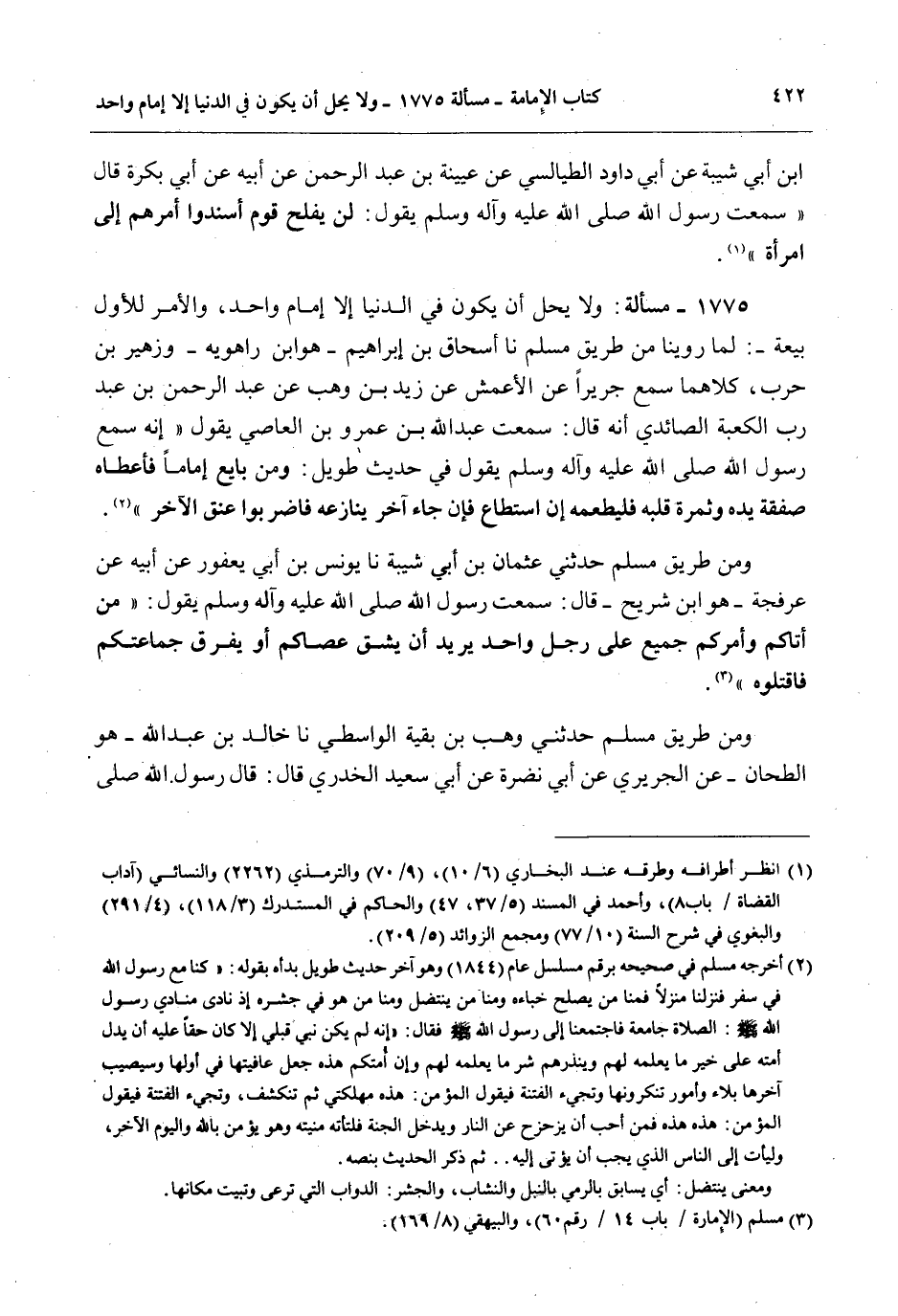 1775 - مَسْأَلَةٌ: وَلَا يَحِلُّ أَنْ يَكُونَ فِي الدُّنْيَا إلَّا إمَامٌ وَاحِدٌ، وَالْأَمْرُ لِلْأَوَّلِ بَيْعَةٌ -: لِمَا رُوِّينَا مِنْ طَرِيقِ مُسْلِمٍ نا إِسْحَاقُ بْنُ إبْرَاهِيمَ - هُوَ ابْنُ رَاهْوَيْهِ - وَزُهَيْرُ بْنُ حَرْبٍ، كِلَاهُمَا سَمِعَ جَرِيرًا عَنْ الْأَعْمَشِ عَنْ زَيْدِ بْنِ وَهْبٍ عَنْ عَبْدِ الرَّحْمَنِ بْنِ عَبْدِ رَبِّ الْكَعْبَةِ الصَّائِدِيِّ أَنَّهُ قَالَ: سَمِعْت عَبْدَ اللَّهِ بْنَ عَمْرِو بْنَ الْعَاصِ يَقُولُ " إنَّهُ سَمِعَ رَسُولَ اللَّهِ - صَلَّى اللَّهُ عَلَيْهِ وَآلِهِ وَسَلَّمَ - يَقُولُ فِي حَدِيثٍ طَوِيلٍ: «وَمَنْ بَايَعَ إمَامًا فَأَعْطَاهُ صَفْقَةَ يَدِهِ وَثَمَرَةَ قَلْبِهِ فَلْيُطْعِمْهُ إنْ اسْتَطَاعَ فَإِنْ جَاءَ آخَرُ يُنَازِعُهُ فَاضْرِبُوا عُنُقَ الْآخَرِ» .