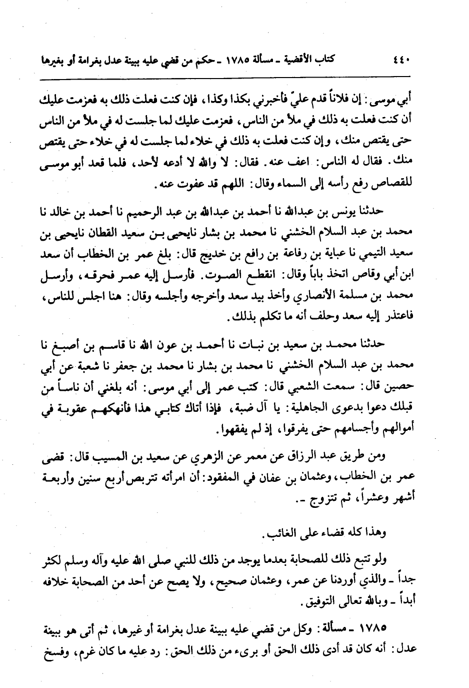 1785 - مَسْأَلَةٌ: وَكُلُّ مَنْ قُضِيَ عَلَيْهِ بِبَيِّنَةِ عَدْلٍ بِغَرَامَةٍ أَوْ غَيْرِهَا، ثُمَّ أَتَى هُوَ بِبَيِّنَةِ عَدْلٍ: أَنَّهُ كَانَ قَدْ أَدَّى ذَلِكَ الْحَقَّ أَوْ بَرِئَ مِنْ ذَلِكَ الْحَقِّ: رُدَّ عَلَيْهِ مَا كَانَ غَرِمَ، وَفُسِخَ