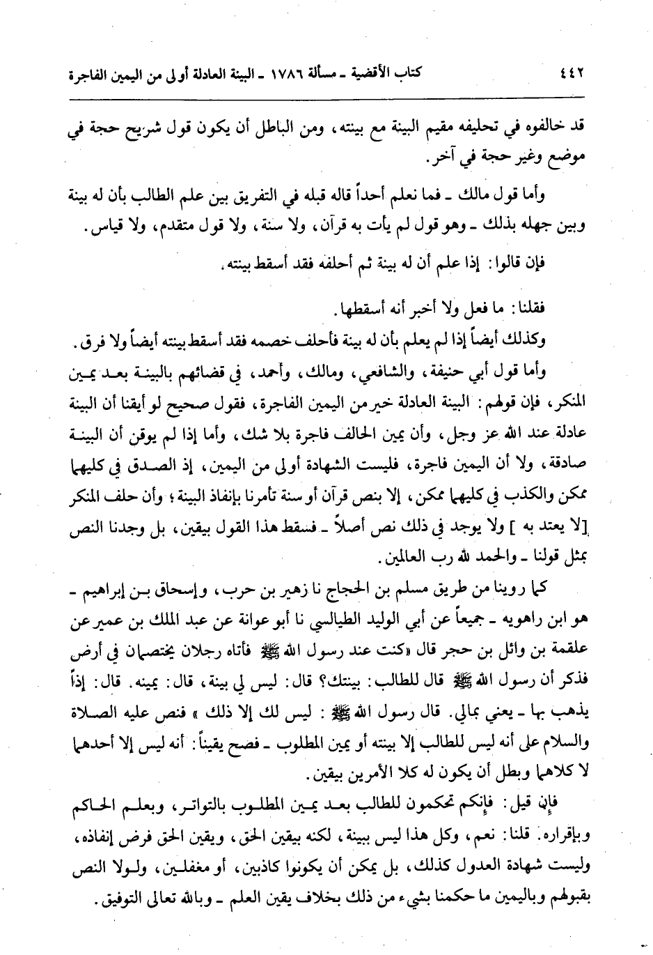 وَأَمَّا قَوْلُ أَبِي حَنِيفَةَ، وَالشَّافِعِيِّ، وَمَالِكٍ، وَأَحْمَدَ، فِي قَضَائِهِمْ بِالْبَيِّنَةِ بَعْدَ يَمِينِ الْمُنْكِرِ، فَإِنَّ قَوْلَهُمْ: الْبَيِّنَةُ الْعَادِلَةُ خَيْرٌ مِنْ الْيَمِينِ الْفَاجِرَةِ، فَقَوْلٌ صَحِيحٌ لَوْ أَيْقَنَّا أَنَّ الْبَيِّنَةَ عَادِلَةٌ عِنْدَ اللَّهِ عَزَّ وَجَلَّ، وَأَنَّ يَمِينَ الْحَالِفِ فَاجِرَةٌ بِلَا شَكٍّ، وَأَمَّا إذَا لَمْ يُوقِنْ أَنَّ الْبَيِّنَةَ صَادِقَةٌ، وَلَا أَنَّ الْيَمِينَ فَاجِرَةٌ، فَلَيْسَتْ الشَّهَادَةُ أَوْلَى مِنْ الْيَمِينِ، إذْ الصِّدْقُ فِي كِلَيْهِمَا مُمْكِنٌ وَالْكَذِبُ فِي كِلَيْهِمَا مُمْكِنٌ، إلَّا بِنَصِّ قُرْآنٍ أَوْ سُنَّةٍ تَأْمُرُنَا بِإِنْفَاذِ الْبَيِّنَةِ؛ وَإِنْ حَلَفَ الْمُنْكِرُ وَلَا يُوجَدُ فِي ذَلِكَ نَصٌّ أَصْلًا - فَسَقَطَ هَذَا الْقَوْلُ بِيَقِينٍ، بَلْ وَجَدْنَا النَّصَّ بِمِثْلِ قَوْلِنَا - وَالْحَمْدُ لِلَّهِ رَبِّ الْعَالَمِينَ.