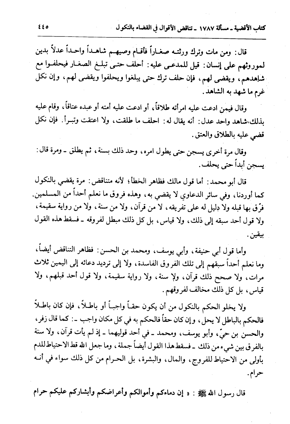 وَلَا يَخْلُو الْحُكْمُ بِالنُّكُولِ مِنْ أَنْ يَكُونَ حَقًّا وَاجِبًا أَوْ بَاطِلًا، فَإِنْ كَانَ بَاطِلًا فَالْحُكْمُ بِالْبَاطِلِ لَا يَحِلُّ، وَإِنْ كَانَ حَقًّا فَالْحُكْمُ بِهِ فِي كُلِّ مَكَان وَاجِبٌ -: كَمَا قَالَ زُفَرُ، وَالْحَسَنُ بْنُ حَيٍّ، وَأَبُو يُوسُفَ، وَمُحَمَّدٌ - فِي أَحَدِ قَوْلَيْهِمَا - إذْ لَمْ يَأْتِ قُرْآنٌ، وَلَا سُنَّةٌ بِالْفَرْقِ بَيْنَ شَيْءٍ مِنْ ذَلِكَ - فَسَقَطَ هَذَا الْقَوْلُ أَيْضًا جُمْلَةً، وَمَا جَعَلَ اللَّهُ قَطُّ الِاحْتِيَاطَ لِلدَّمِ بِأَوْلَى مِنْ الِاحْتِيَاطِ لِلْفُرُوجِ، وَالْمَالِ، وَالْبَشَرَةِ، بَلْ الْحَرَامُ مِنْ كُلِّ ذَلِكَ سَوَاءٌ فِي أَنَّهُ حَرَامٌ. قَالَ رَسُولُ اللَّهِ - صَلَّى اللَّهُ عَلَيْهِ وَسَلَّمَ -: «إنَّ دِمَاءَكُمْ وَأَمْوَالَكُمْ وَأَعْرَاضَكُمْ وَأَبْشَارَكُمْ عَلَيْكُمْ حَرَامٌ