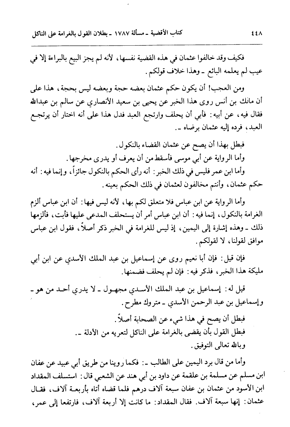 فَبَطَلَ الْقَوْلُ بِأَنْ يُقْضَى بِالْغَرَامَةِ عَلَى النَّاكِلِ لِتَعَرِّيهِ مِنْ الْأَدِلَّةِ -.