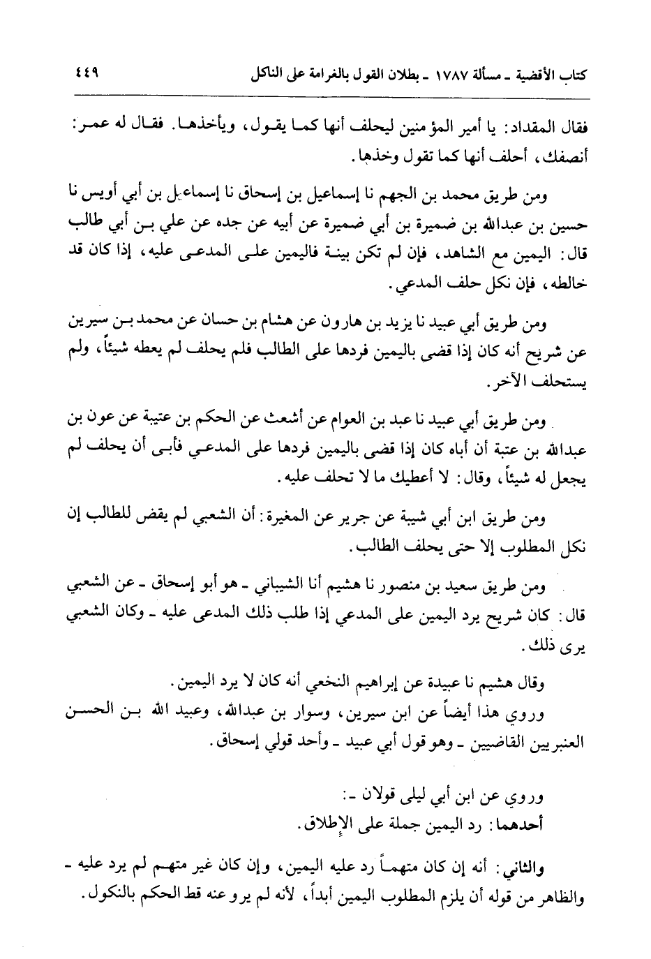 وَقَالَ هُشَيْمٌ نا عُبَيْدَةُ عَنْ إبْرَاهِيمَ النَّخَعِيِّ أَنَّهُ كَانَ لَا يَرُدُّ الْيَمِينَ وَرُوِيَ هَذَا أَيْضًا عَنْ ابْنِ سِيرِينَ، وَسَوَّارِ بْنِ عَبْدِ اللَّهِ، وَعُبَيْدِ اللَّهِ بْنِ الْحَسَنِ الْعَنْبَرِيِّينَ الْقَاضِيَيْنِ - هُوَ قَوْلُ أَبِي عُبَيْدٍ - وَأَحَدُ قَوْلَيْ إِسْحَاقَ.