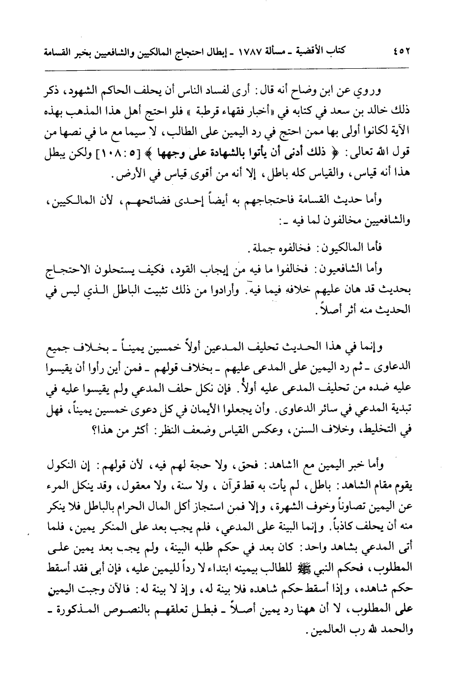 وَرُوِيَ عَنْ ابْنِ وَضَّاحٍ أَنَّهُ قَالَ: أَرَى لِفَسَادِ النَّاسِ أَنْ يُحَلِّفَ الْحَاكِمُ الشُّهُودَ، ذَكَرَ ذَلِكَ خَالِدُ بْنُ سَعْدٍ فِي كِتَابِهِ فِي " أَخْبَارِ فُقَهَاءِ قُرْطُبَةَ " فَلَوْ احْتَجَّ أَهْلُ هَذَا الْمَذْهَبِ بِهَذِهِ الْآيَةِ لَكَانُوا أَوْلَى بِهَا مِمَّنْ احْتَجَّ فِي رَدِّ الْيَمِينِ عَلَى الطَّالِبِ، لَا سِيَّمَا مَعَ مَا فِي نَصِّهَا مِنْ قَوْلِ اللَّهِ تَعَالَى: {ذَلِكَ أَدْنَى أَنْ يَأْتُوا بِالشَّهَادَةِ عَلَى وَجْهِهَا} [المائدة: 108] وَلَكِنْ يُبْطِلُ هَذَا أَنَّهُ قِيَاسٌ، وَالْقِيَاسُ كُلُّهُ بَاطِلٌ، إلَّا أَنَّهُ مِنْ أَقْوَى قِيَاسٍ فِي الْأَرْضِ.