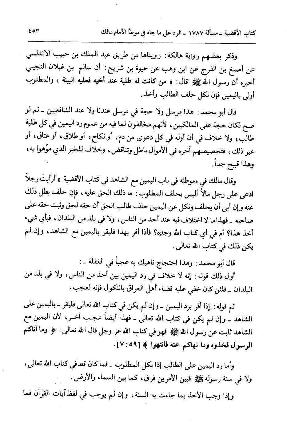 وَقَالَ مَالك فِي " مُوَطَّئِهِ فِي بَابِ الْيَمِينِ مَعَ الشَّاهِدِ فِي كِتَابِ الْأَقْضِيَةِ " أَرَأَيْت رَجُلًا ادَّعَى عَلَى رَجُلٍ مَالًا أَلَيْسَ يَحْلِفُ الْمَطْلُوبُ: مَا ذَلِكَ الْحَقُّ عَلَيْهِ، فَإِنْ حَلَفَ بَطَلَ ذَلِكَ عَنْهُ وَإِنْ أَبَى أَنْ يَحْلِفَ وَنَكَلَ عَنْ الْيَمِينِ حَلَفَ طَالِبُ الْحَقِّ أَنَّ حَقَّهُ لَحَقٌّ وَثَبَتَ حَقُّهُ عَلَى صَاحِبِهِ - فَهَذَا مَا لَا اخْتِلَافَ فِيهِ عِنْدَ أَحَدٍ مِنْ النَّاسِ، وَلَا فِي بَلَدٍ مِنْ الْبُلْدَانِ، فَبِأَيِّ شَيْءٍ أَخَذَ هَذَا؟ أَمْ فِي أَيِّ كِتَابِ اللَّهِ وَجَدَهُ؟ فَإِذَا أَقَرَّ بِهَذَا فَلْيُقِرَّ بِالْيَمِينِ مَعَ الشَّاهِدِ، وَإِنْ لَمْ يَكُنْ ذَلِكَ فِي كِتَابِ اللَّهِ تَعَالَى.