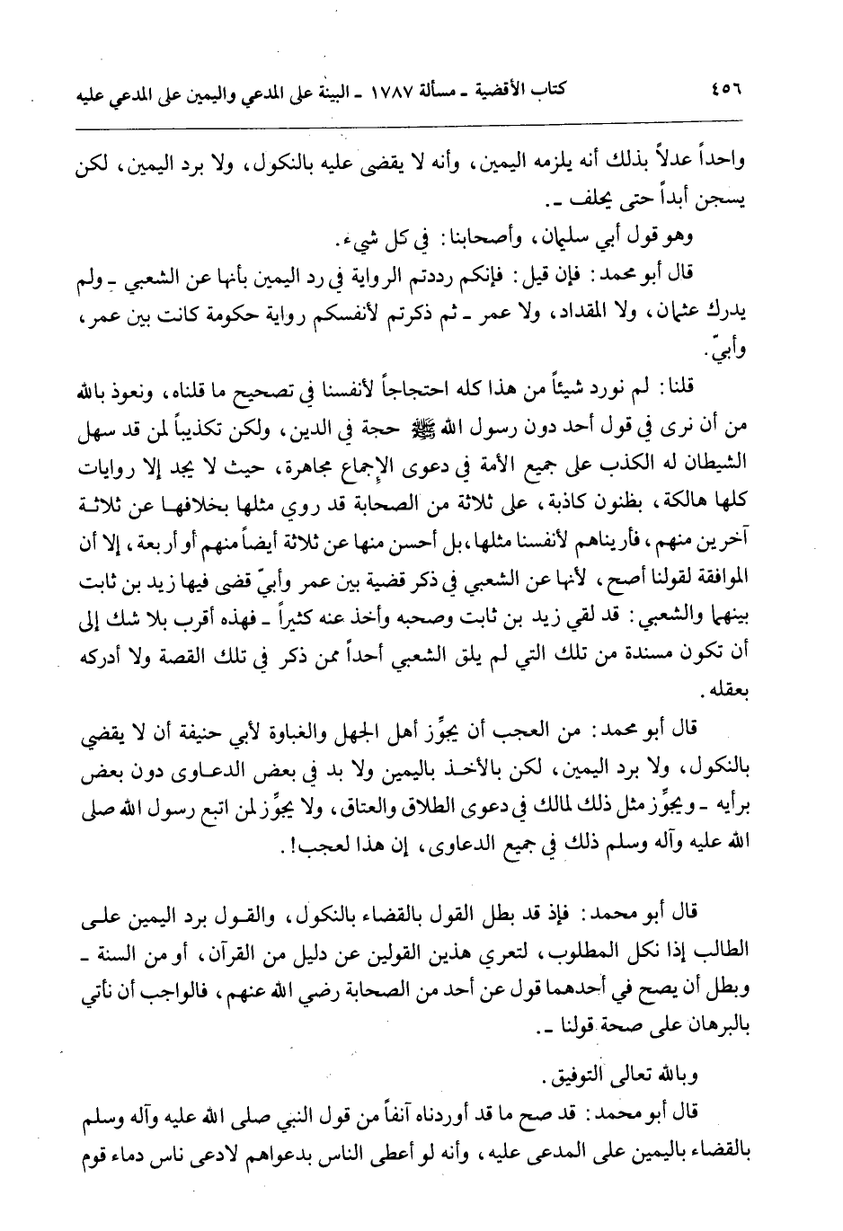 قَالَ أَبُو مُحَمَّدٍ: فَإِذْ قَدْ بَطَلَ الْقَوْلُ بِالْقَضَاءِ بِالنُّكُولِ، وَالْقَوْلُ بِرَدِّ الْيَمِينِ عَلَى الطَّالِبِ إذَا نَكَلَ الْمَطْلُوبُ، لِتَعَرِّي هَذَيْنِ الْقَوْلَيْنِ عَنْ دَلِيلٍ مِنْ الْقُرْآنِ، أَوْ مِنْ السُّنَّةِ - وَبَطَلَ أَنْ يَصِحَّ فِي أَحَدِهِمَا قَوْلٌ عَنْ أَحَدٍ مِنْ الصَّحَابَةِ - رَضِيَ اللَّهُ عَنْهُمْ -، فَالْوَاجِبُ أَنْ نَأْتِيَ بِالْبُرْهَانِ عَلَى صِحَّةِ قَوْلِنَا -.