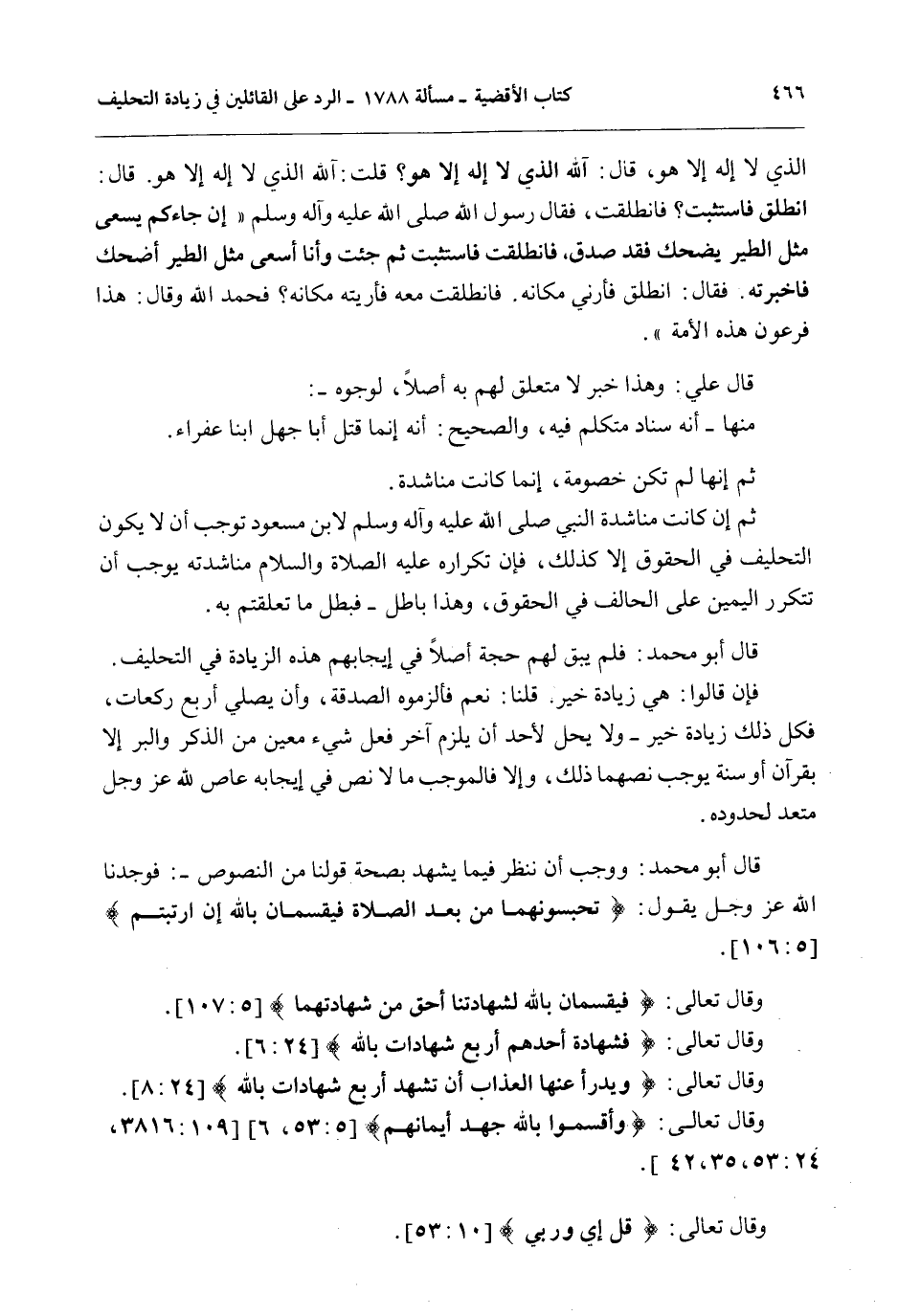 قَالَ أَبُو مُحَمَّدٍ: وَوَجَبَ أَنْ نَنْظُرَ فِيمَا يَشْهَدُ بِصِحَّةِ قَوْلِنَا مِنْ النُّصُوصِ -: فَوَجَدْنَا اللَّهَ عَزَّ وَجَلَّ يَقُولُ: {تَحْبِسُونَهُمَا مِنْ بَعْدِ الصَّلاةِ فَيُقْسِمَانِ بِاللَّهِ إِنِ ارْتَبْتُمْ} [المائدة: 106] .