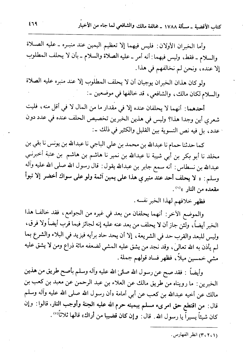 وَأَيْضًا: فَقَدْ صَحَّ عَنْ رَسُولِ اللَّهِ - صَلَّى اللَّهُ عَلَيْهِ وَآلِهِ وَسَلَّمَ - بِأَصَحِّ طَرِيقٍ مِنْ هَذَيْنِ الْخَبَرَيْنِ: مَا رُوِّينَاهُ مِنْ طَرِيقِ مَالِكٍ عَنْ الْعَلَاءِ بْنِ عَبْدِ الرَّحْمَنِ عَنْ مَعْبَدِ بْنِ كَعْبِ بْنِ مَالِكٍ عَنْ أَخِيهِ عَبْدِ اللَّهِ بْنِ كَعْبٍ عَنْ أَبِي أُمَامَةَ " أَنَّ رَسُولَ اللَّهِ - صَلَّى اللَّهُ عَلَيْهِ وَآلِهِ وَسَلَّمَ - قَالَ: «مَنْ اقْتَطَعَ حَقَّ امْرِئٍ مُسْلِمٍ بِيَمِينِهِ حَرَّمَ اللَّهُ عَلَيْهِ الْجَنَّةَ وَأَوْجَبَ النَّارَ، قَالُوا: وَإِنْ كَانَ شَيْئًا يَسِيرًا يَا رَسُولَ اللَّهِ قَالَ: وَإِنْ كَانَ قَضِيبًا مِنْ أَرَاكٍ قَالَهَا ثَلَاثًا» .